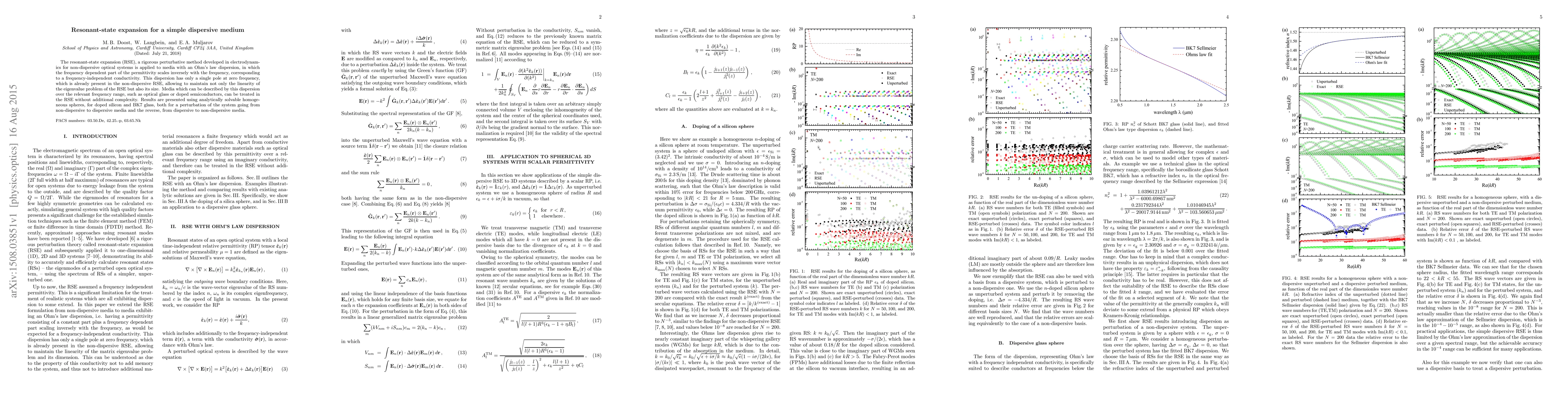 This paper applies the resonant-state expansion (RSE) to dispersive media with Ohm's law dispersion, maintaining the linearity and size of the RSE. Analytical results for doped silicon and BK7 glass demonstrate the method's effectiveness in treating such media without additional complexity.