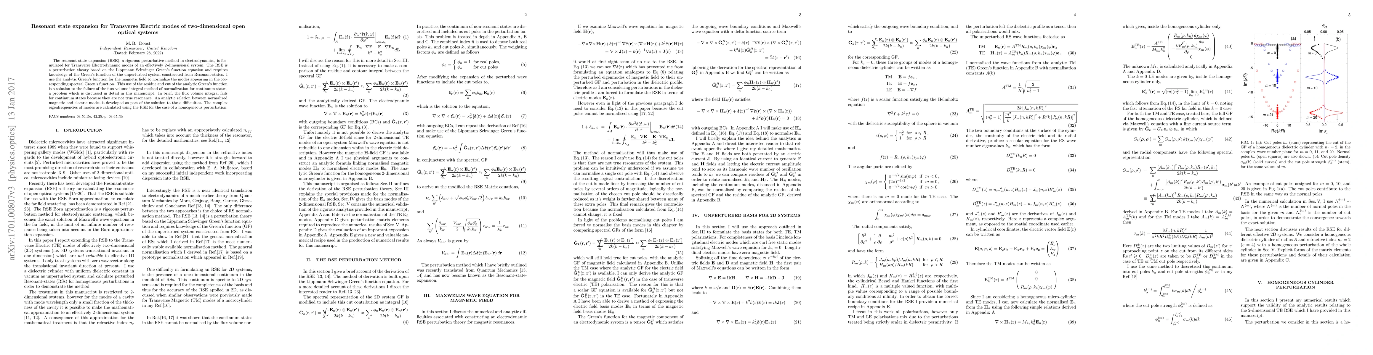 The resonant state expansion (RSE), a rigorous perturbative method in electrodynamics, is formulated for Transverse Electrodynamic modes of an effectively $2$-dimensional system. The RSE is a perturbation theory based on the Lippmann Schwinger Green's function equation and requires knowledge of the Green's function of the unperturbed system constructed from Resonant-states. I use the analytic Green's function for the magnetic field to normalize the modes appearing in the corresponding spectral Green's function. This use of the residue and cut of the analytic Green's function is a solution to the failure of the flux volume integral method of normalization for continuum states, a problem which is discussed in detail in this manuscript. In brief, the flux volume integral fails for continuum states because they are not true resonance. An analytic relation between normalized magnetic and electric modes is developed as part of the solution to these difficulties.The complex eigenfrequencies of modes are calculated using the RSE for the case of a homogeneous perturbation.