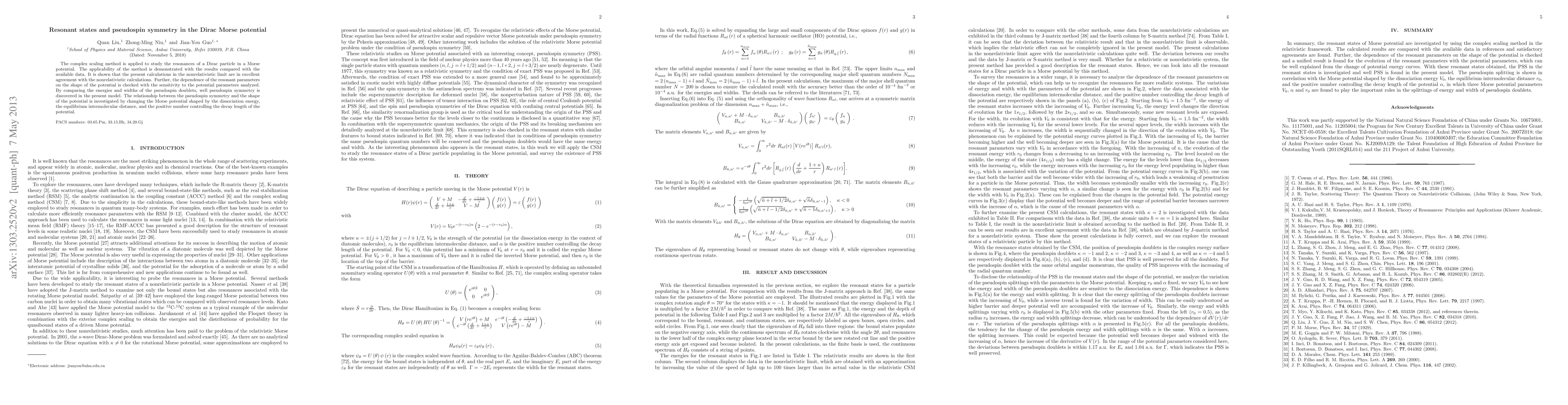 Researchers used complex scaling to study resonances in a Dirac particle in a Morse potential, discovering pseudospin symmetry and its unusual sensitivity to the potential shape.
