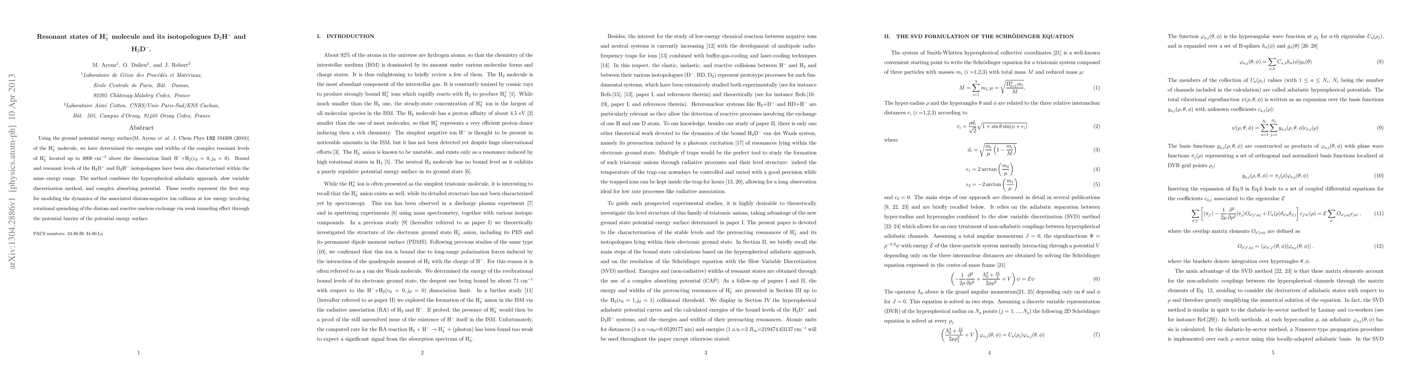 This research determines the energies and widths of resonant states in H$_3^-$ and its isotopologues D$_2$H$^-$ and H$_2$D$^-$ up to 4000 cm$^{-1}$ above the dissociation limit, using a combination of the hyperspherical adiabatic approach and complex absorbing potential. These findings lay the groundwork for modeling low-energy collision dynamics involving rotational quenching and reactive nucleus exchange.