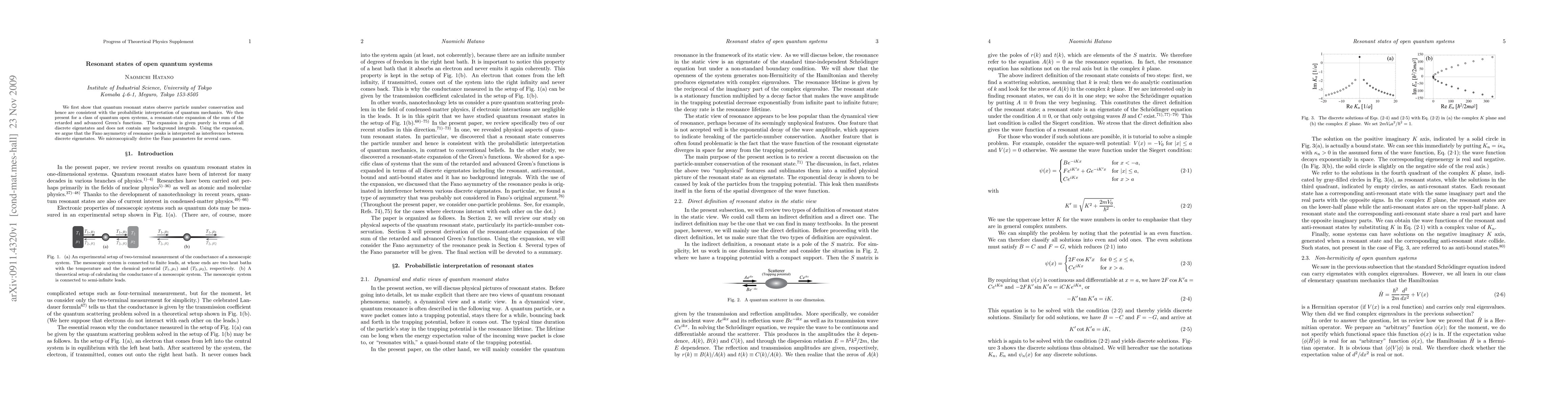This paper demonstrates that quantum resonant states conserve particle number, aligning with quantum mechanics' probabilistic interpretation. It introduces a resonant-state expansion for open quantum systems, expressed solely in terms of discrete eigenstates, and uses it to interpret the Fano asymmetry as interference between these states, deriving the Fano parameters for various scenarios.