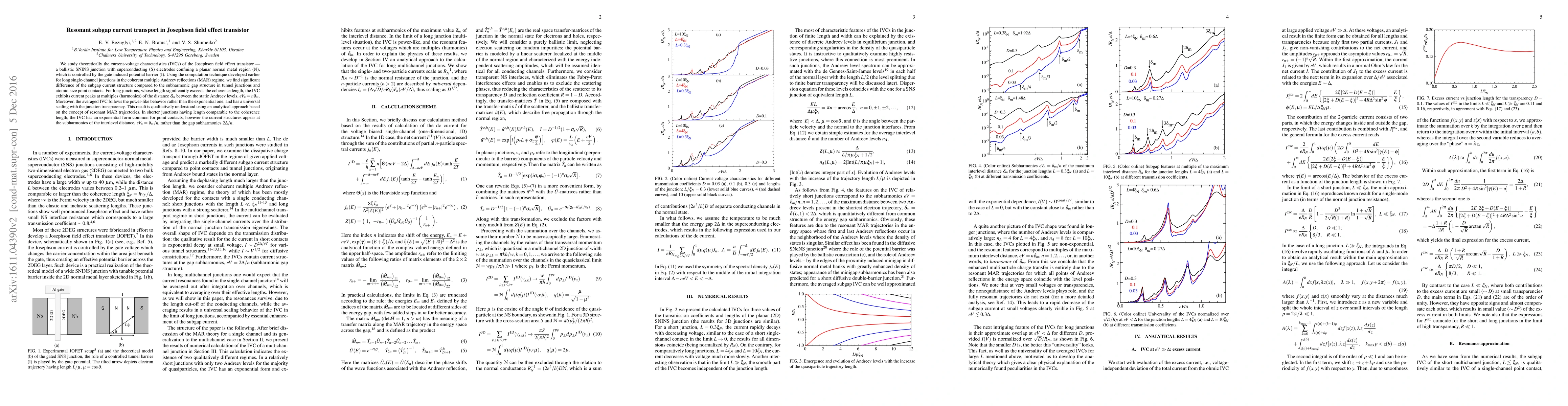 This paper theoretically investigates the current-voltage characteristics of Josephson field effect transistors, revealing distinct subgap current structures compared to tunnel junctions. Long junctions exhibit current peaks at multiples of the difference between static Andreev levels, while shorter junctions show exponential behavior with current structures at subharmonics of the Andreev interlevel distance.