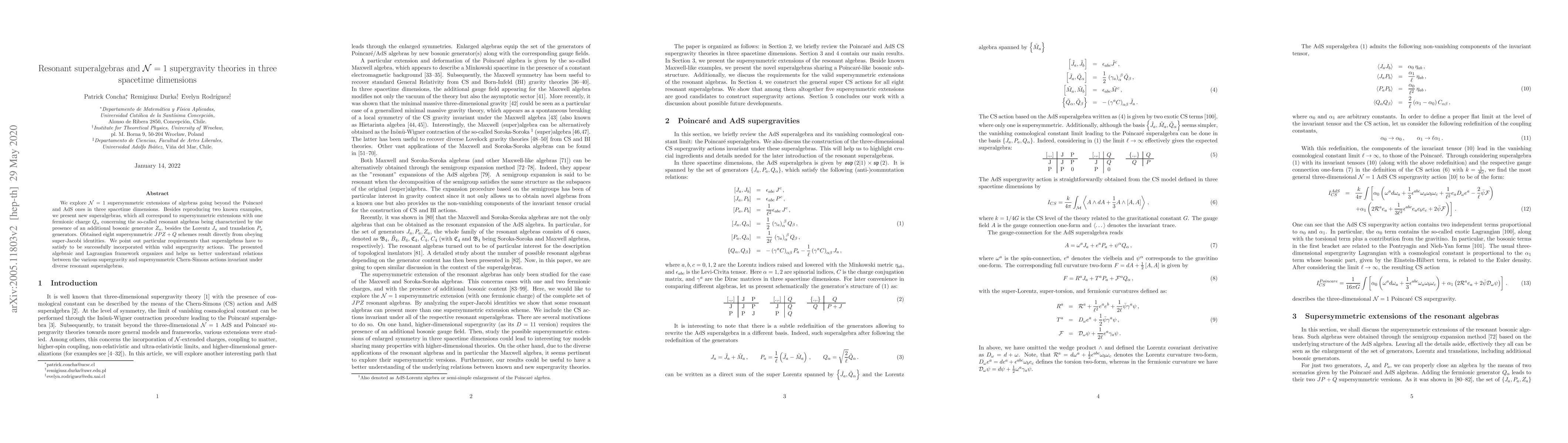 This paper investigates $\mathcal{N}=1$ supersymmetric extensions of resonant algebras in three dimensions, introducing new superalgebras beyond Poincaré and AdS. It presents eight novel $JPZ+Q$ schemes derived from super-Jacobi identities and outlines conditions for these superalgebras to support valid supergravity actions, thus clarifying the connections between diverse supergravity and Chern-Simons theories.