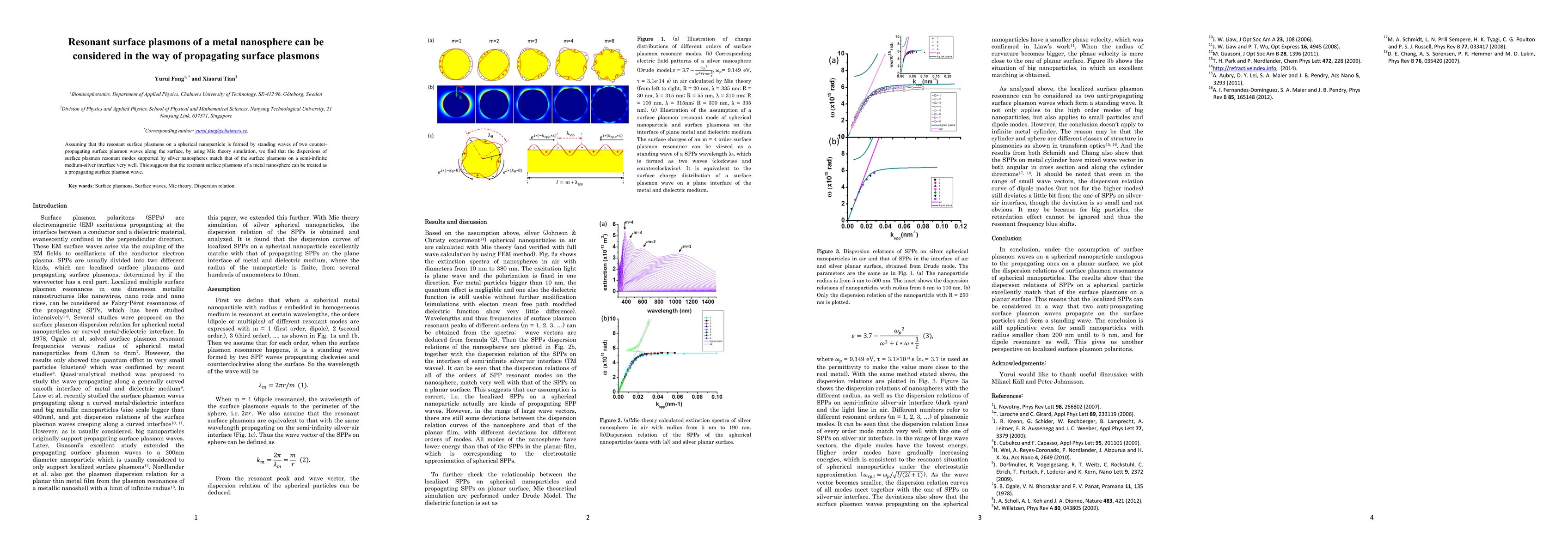 Summary: This research reveals that the resonant surface plasmons on a metal nanosphere can be modeled as propagating surface plasmon waves, as demonstrated by Mie theory simulations showing good agreement between the dispersions of surface plasmon modes in nanospheres and semi-infinite metal interfaces.