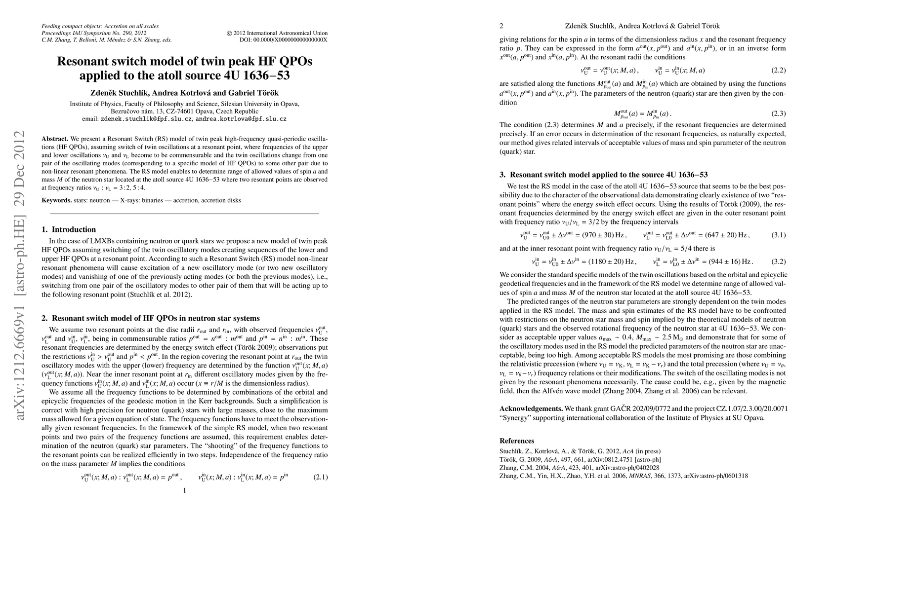 This paper introduces a Resonant Switch model to explain twin peak high-frequency quasi-periodic oscillations (HF QPOs) in the atoll source 4U 1636-53, suggesting that oscillations switch at resonant points where frequencies become commensurable, allowing determination of neutron star spin and mass. The model identifies two resonant points at frequency ratios 3:2 and 5:4.