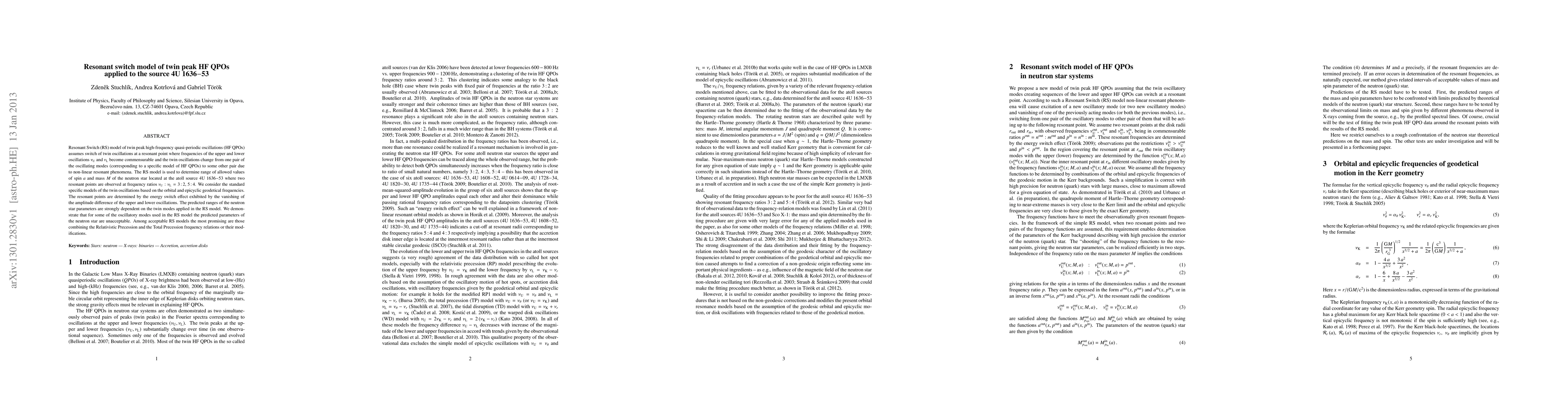 This paper applies the Resonant Switch model to the neutron star in 4U 1636-53 to determine its spin and mass based on observed twin peak HF QPOs. The model predicts ranges of neutron star parameters, with the most promising results coming from combinations of Relativistic and Total Precession frequencies.