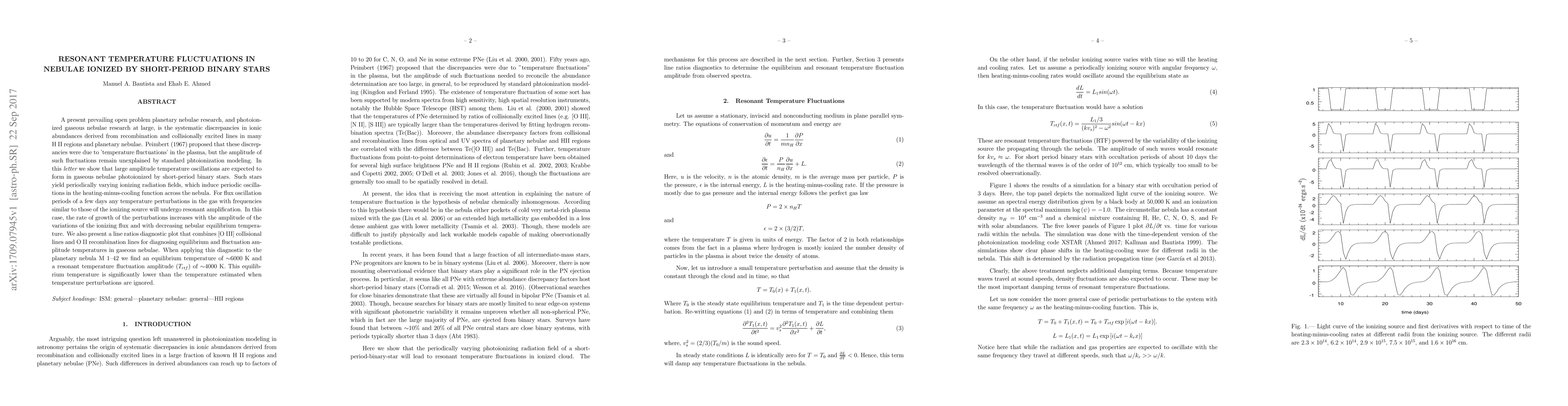 A present prevailing open problem planetary nebulae research, and photoionized gaseous nebulae research at large, is the systematic discrepancies in ionic abundances derived from recombination and collisionally excited lines in many H II regions and planetary nebulae. Peimbert (1967) proposed that these discrepancies were due to 'temperature fluctuations' in the plasma, but the amplitude of such fluctuations remain unexplained by standard phtoionization modeling. In this letter we show that large amplitude temperature oscillations are expected to form in gaseous nebulae photoionized by short-period binary stars. Such stars yield periodically varying ionizing radiation fields, which induce periodic oscilla- tions in the heating-minus-cooling function across the nebula. For flux oscillation periods of a few days any temperature perturbations in the gas with frequencies similar to those of the ionizing source will undergo resonant amplification. In this case, the rate of growth of the perturbations increases with the amplitude of the variations of the ionizing flux and with decreasing nebular equilibrium temperature. We also present a line ratios diagnostic plot that combines [O III] collisional lines and O II recombination lines for diagnosing equilibrium and fluctuation am- plitude temperatures in gaseous nebulae. When applying this diagnostic to the planetary nebula M 1-42 we find an equilibrium temperature of ~6000 K and a resonant temperature fluctuation amplitude (Trtf ) of ~4000 K. This equilibrium temperature is significantly lower than the temperature estimated when temperature perturbations are ignored.