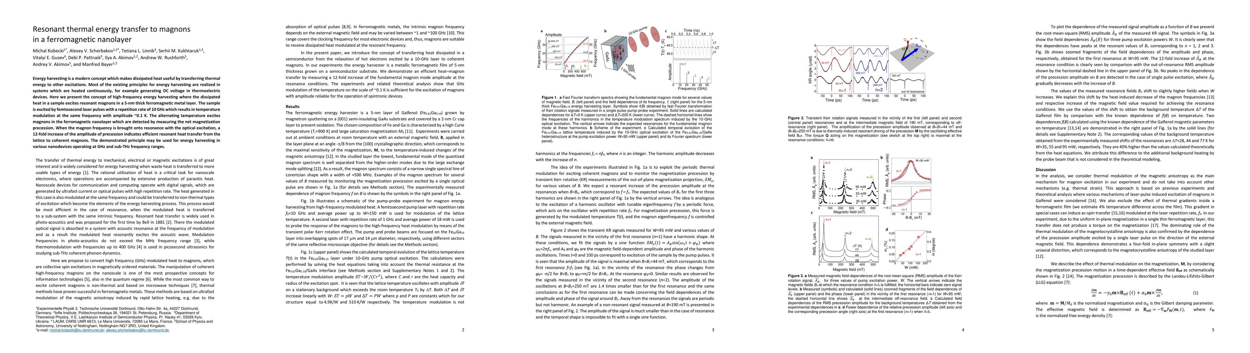 This paper explores high-frequency energy harvesting by resonantly transferring thermal energy from a 5-nm ferromagnetic nanolayer to magnons using femtosecond laser pulses. The resonant magnon excitation results in a 12-fold increase in magnetization precession amplitude, indicating efficient heat transfer, which could enable energy harvesting in GHz and sub-THz frequency devices.