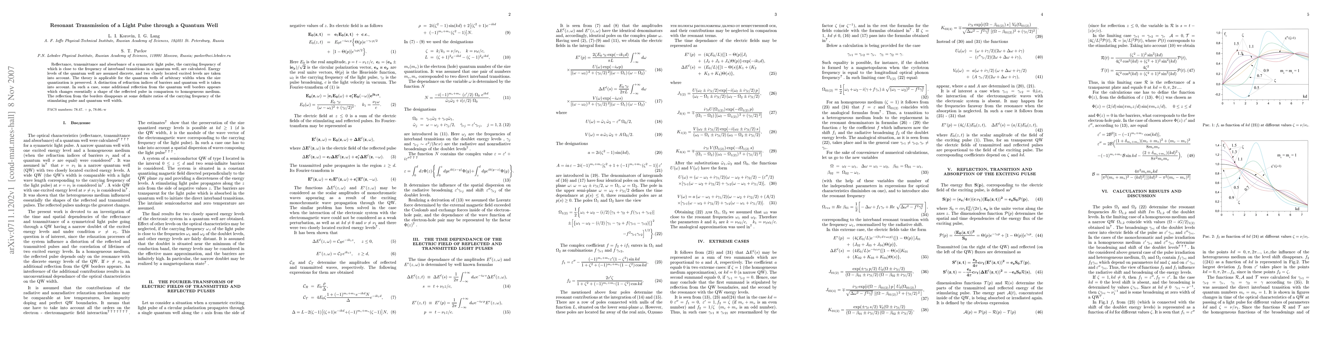 Reflectance, transmittance and absorbance of a symmetric light pulse, the carrying frequency of which is close to the frequency of interband transitions in a quantum well, are calculated. Energy levels of the quantum well are assumed discrete, and two closely located excited levels are taken into account. The theory is applicable for the quantum wells of arbitrary widths when the size quantization is preserved. A distinction of refraction indices of barriers and quantum well is taken into account. In such a case, some additional reflection from the quantum well borders appears which changes essentially a shape of the reflected pulse in comparison to homogeneous medium. The reflection from the borders disappears at some definite ratios of the carrying frequency of the stimulating pulse and quantum well width.