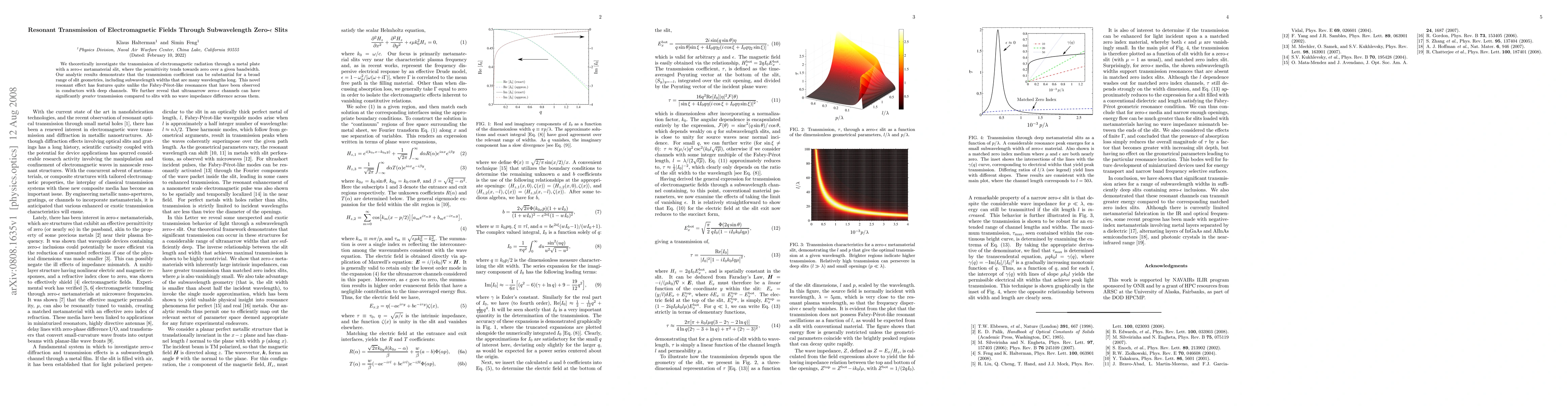 This paper investigates the transmission of electromagnetic fields through slits in metal plates filled with zero-$\epsilon$ metamaterials, showing substantial transmission coefficients for subwavelength slits. The study reveals a novel resonant effect that results in significantly higher transmission compared to traditional slits, differing from typical Fabry-Pérot resonances.