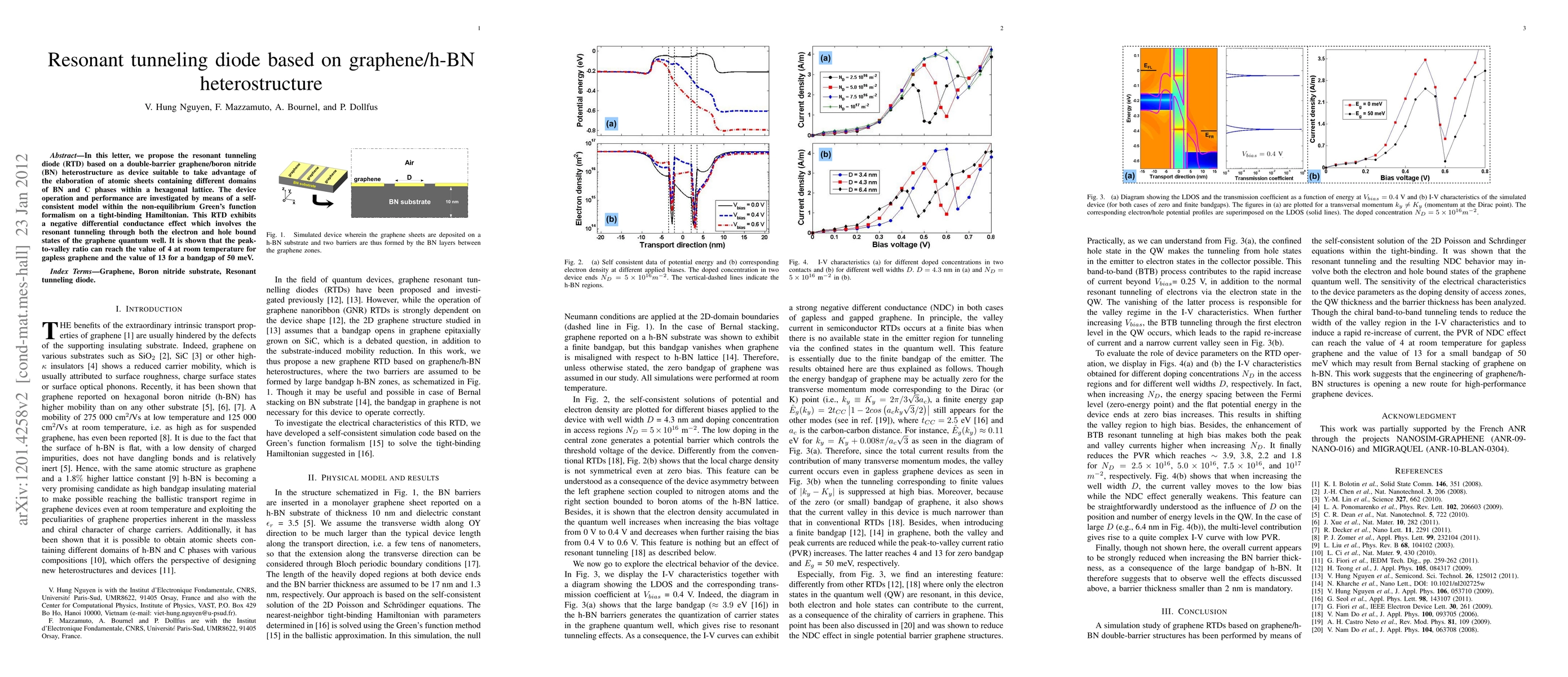 The proposed graphene RTD based on graphene/h-BN heterostructures distinguishes itself from previous graphene RTDs by not requiring a bandgap in graphene to operate correctly and by exploiting the unique properties of h-BN as a high-quality insulating substrate.