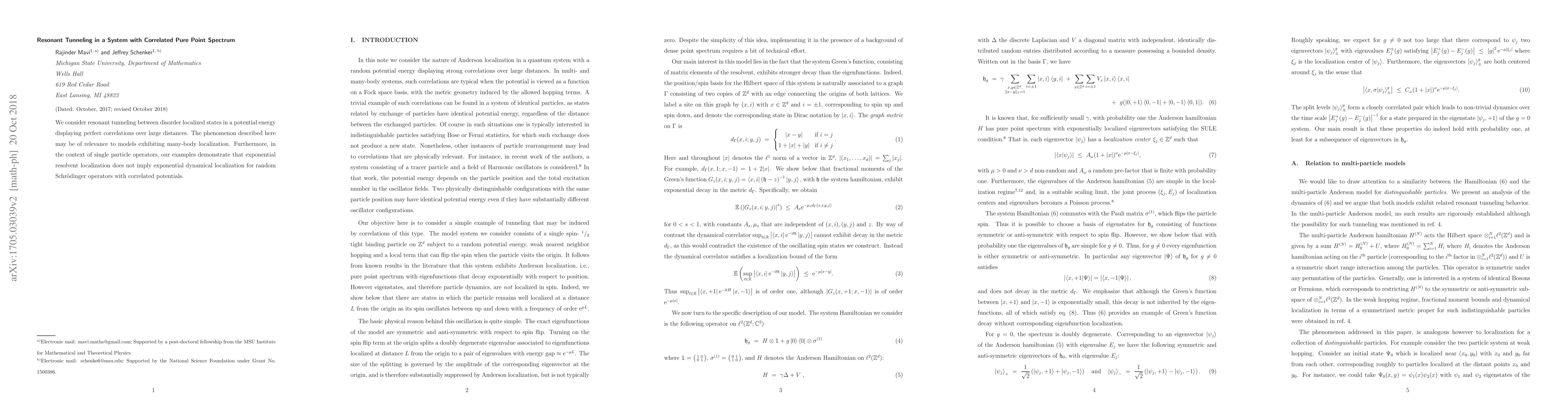 We consider resonant tunneling between disorder localized states in a potential energy displaying perfect correlations over large distances. The phenomenon described here may be of relevance to models exhibiting many-body localization. Furthermore, in the context of single particle operators, our examples demonstrate that exponential resolvent localization does not imply exponential dynamical localization for random Schr\"odinger operators with correlated potentials.