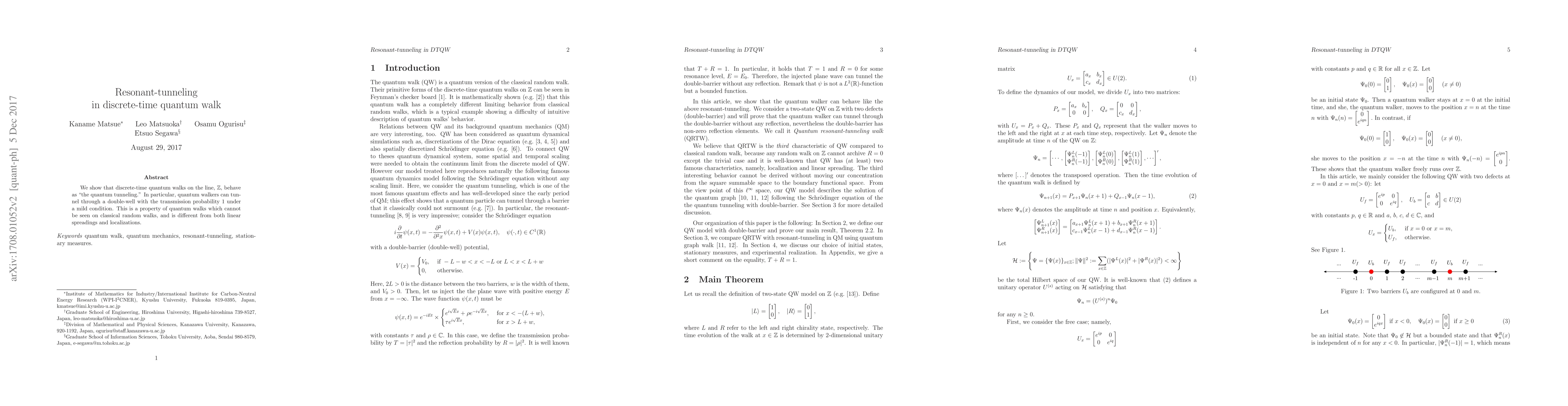 We show that discrete-time quantum walks on the line, $\mathbb{Z}$, behave as "the quantum tunneling". In particular, quantum walkers can tunnel through a double-well with the transmission probability $1$ under a mild condition. This is a property of quantum walks which cannot be seen on classical random walks, and is different from both linear spreadings and localizations.