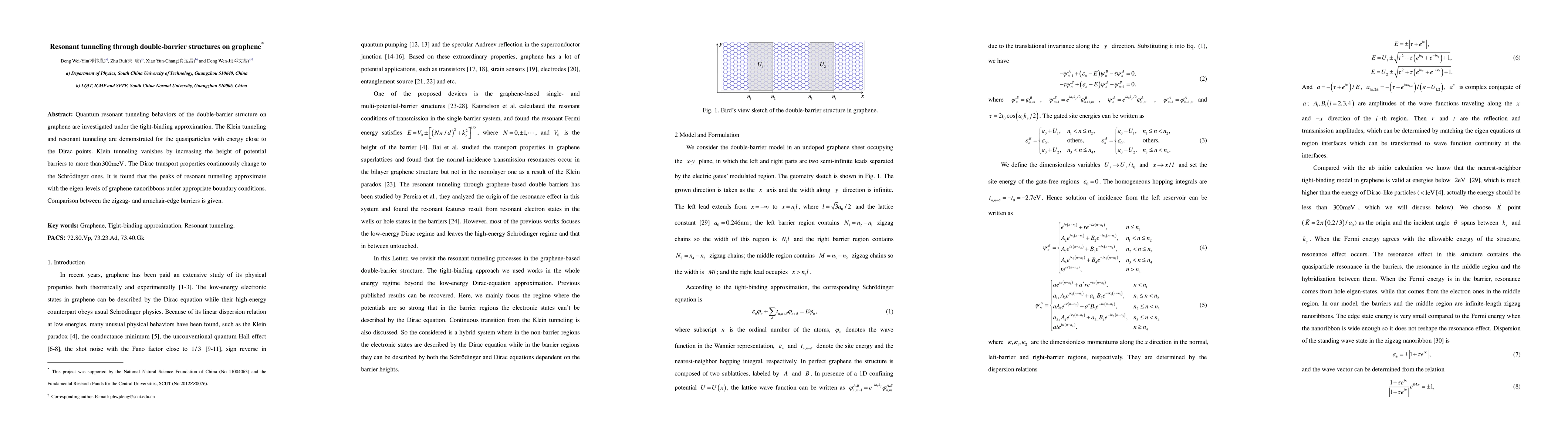 Quantum resonant tunneling behaviors of double-barrier structures on graphene are investigated under the tight-binding approximation. The Klein tunneling and resonant tunneling are demonstrated for the quasiparticles with energy close to the Dirac points. The Klein tunneling vanishes by increasing the height of the potential barriers to more than 300 meV. The Dirac transport properties continuously change to the Schrodinger ones. It is found that the peaks of resonant tunneling approximate to the eigen-levels of graphene nanoribbons under appropriate boundary conditions. A comparison between the zigzag- and armchair-edge barriers is given.