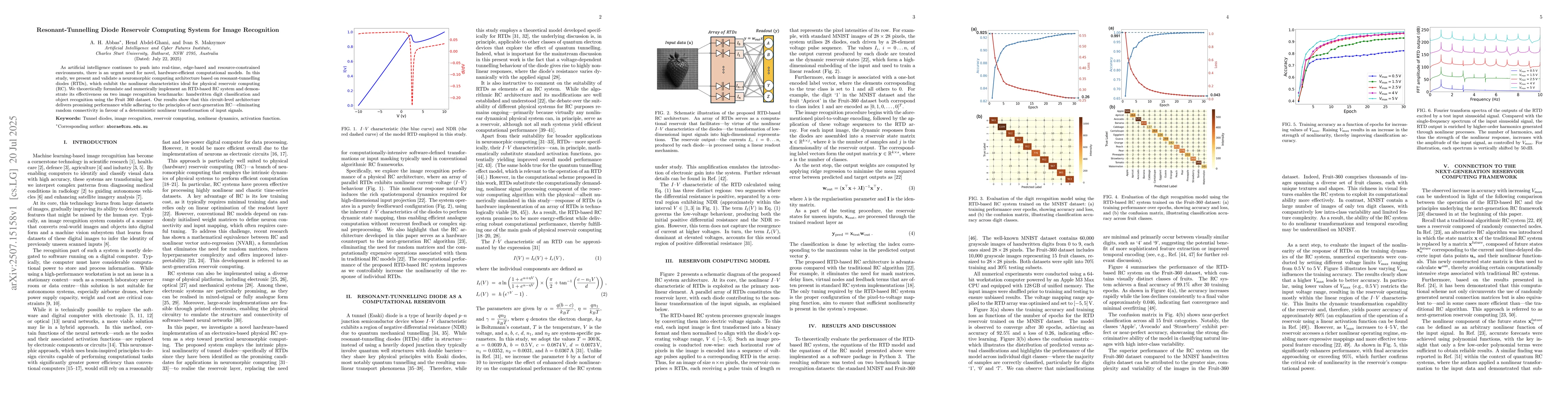 As artificial intelligence continues to push into real-time, edge-based and resource-constrained environments, there is an urgent need for novel, hardware-efficient computational models. In this study, we present and validate a neuromorphic computing architecture based on resonant-tunnelling diodes (RTDs), which exhibit the nonlinear characteristics ideal for physical reservoir computing (RC). We theoretically formulate and numerically implement an RTD-based RC system and demonstrate its effectiveness on two image recognition benchmarks: handwritten digit classification and object recognition using the Fruit~360 dataset. Our results show that this circuit-level architecture delivers promising performance while adhering to the principles of next-generation RC -- eliminating random connectivity in favour of a deterministic nonlinear transformation of input signals.