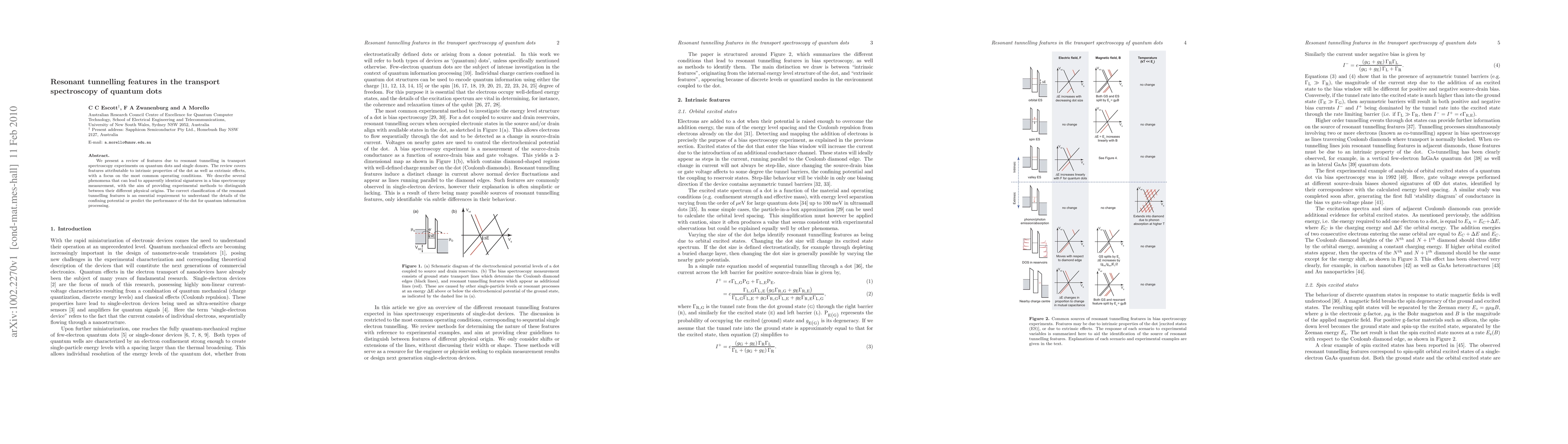 This paper reviews resonant tunnelling phenomena in quantum dot transport spectroscopy, highlighting intrinsic and extrinsic effects. It aims to distinguish between different physical origins of observed signatures to better understand the confining potential and predict quantum information processing performance.