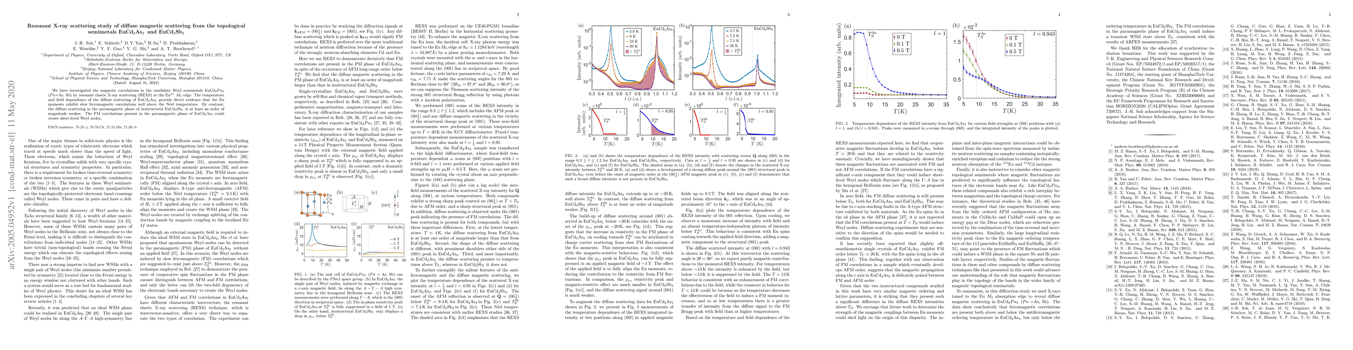 This study uses resonant X-ray scattering to investigate magnetic correlations in the topological semimetals EuCd$_2$As$_2$ and EuCd$_2$Sb$_2$. EuCd$_2$As$_2$ shows strong ferromagnetic correlations above its Néel temperature, suggesting potential for short-lived Weyl nodes, while EuCd$_2$Sb$_2$ exhibits much weaker diffuse scattering.