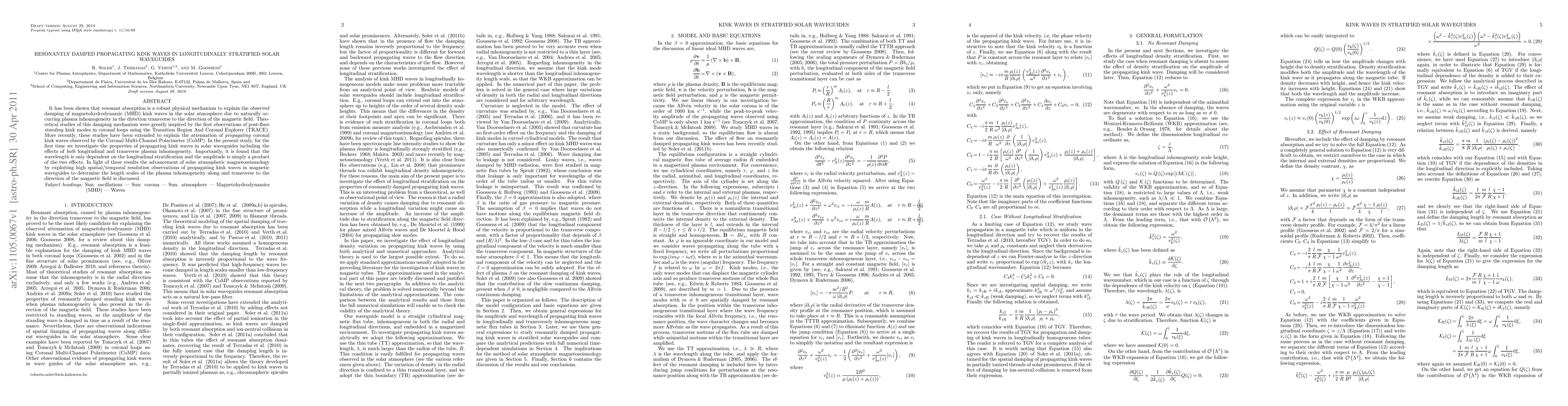 It has been shown that resonant absorption is a robust physical mechanism to explain the observed damping of magnetohydrodynamic (MHD) kink waves in the solar atmosphere due to naturally occurring plasma inhomogeneity in the direction transverse to the direction of the magnetic field. Theoretical studies of this damping mechanism were greatly inspired by the first observations of post-flare standing kink modes in coronal loops using the Transition Region And Coronal Explorer (TRACE). More recently, these studies have been extended to explain the attenuation of propagating coronal kink waves observed by the Coronal Multi-Channel Polarimeter (CoMP). In the present study, for the first time we investigate the properties of propagating kink waves in solar waveguides including the effects of both longitudinal and transverse plasma inhomogeneity. Importantly, it is found that the wavelength is only dependent on the longitudinal stratification and the amplitude is simply a product of the two effects. In light of these results the advancement of solar atmospheric magnetoseismology by exploiting high spatial/temporal resolution observations of propagating kink waves in magnetic waveguides to determine the length scales of the plasma inhomogeneity along and transverse to the direction of the magnetic field is discussed.
