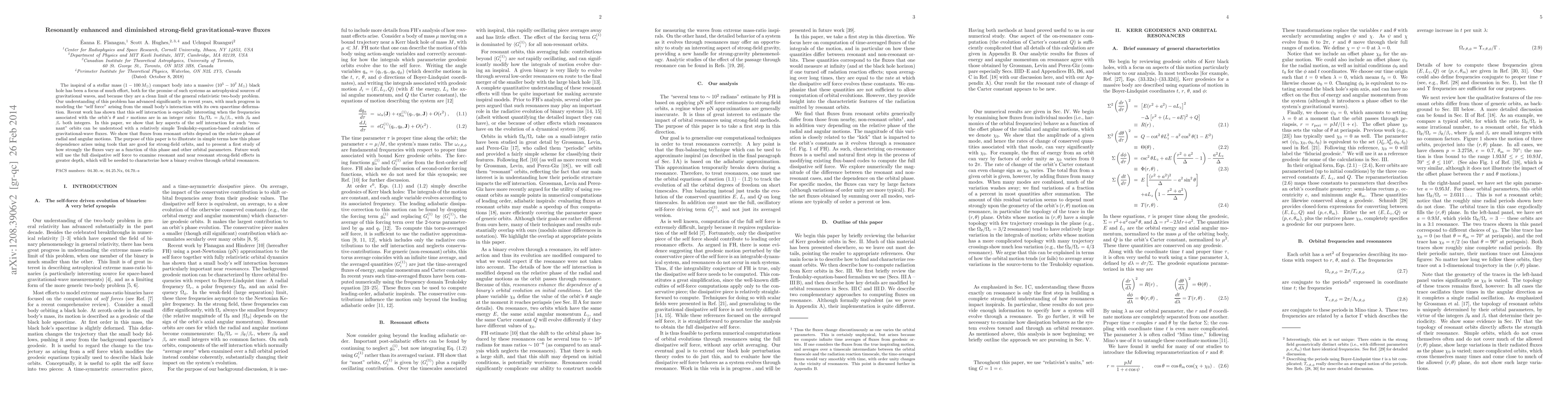 The inspiral of a stellar mass ($1 - 100\,M_\odot$) compact body into a massive ($10^5 - 10^7\,M_\odot$) black hole has been a focus of much effort, both for the promise of such systems as astrophysical sources of gravitational waves, and because they are a clean limit of the general relativistic two-body problem. Our understanding of this problem has advanced significantly in recent years, with much progress in modeling the "self force" arising from the small body's interaction with its own spacetime deformation. Recent work has shown that this self interaction is especially interesting when the frequencies associated with the orbit's $\theta$ and $r$ motions are in an integer ratio: $\Omega_\theta/\Omega_r = \beta_\theta/\beta_r$, with $\beta_\theta$ and $\beta_r$ both integers. In this paper, we show that key aspects of the self interaction for such "resonant" orbits can be understood with a relatively simple Teukolsky-equation-based calculation of gravitational-wave fluxes. We show that fluxes from resonant orbits depend on the relative phase of radial and angular motions. The purpose of this paper is to illustrate in simple terms how this phase dependence arises using tools that are good for strong-field orbits, and to present a first study of how strongly the fluxes vary as a function of this phase and other orbital parameters. Future work will use the full dissipative self force to examine resonant and near resonant strong-field effects in greater depth, which will be needed to characterize how a binary evolves through orbital resonances.