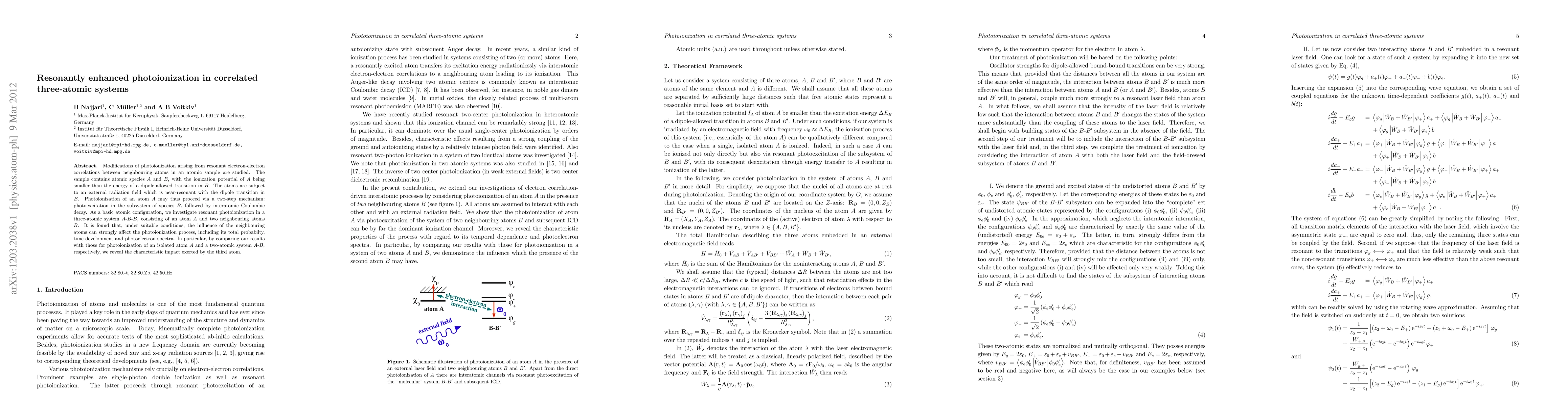 This paper investigates resonantly enhanced photoionization in a three-atomic system where electron-electron correlations between neighboring atoms influence the process. The study reveals that the presence of a third atom can significantly alter the photoionization probability, time dynamics, and photoelectron spectra, highlighting the unique impact of interatomic interactions.