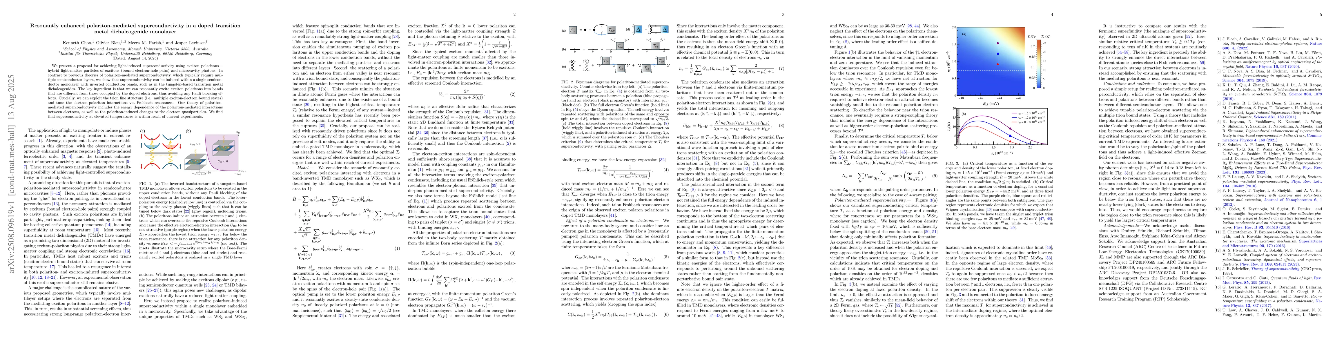 We present a proposal for achieving light-induced superconductivity using exciton polaritons - hybrid light-matter particles of excitons (bound electron-hole pairs) and microcavity photons. In contrast to previous theories of polariton-mediated superconductivity, which typically require multiple semiconductor layers, we show that superconductivity can be induced within a single semiconductor monolayer with inverted conduction bands, such as in the tungsten-based transition metal dichalcogenides. The key ingredient is that we can resonantly excite exciton polaritons into bands that are different from those occupied by the doped electrons, thus avoiding any Pauli blocking effects. Crucially, we can exploit the trion fine structure (i.e., multiple exciton-electron bound states) and tune the electron-polariton interactions via Feshbach resonances. Our theory of polariton-mediated superconductivity includes the energy dependence of the polariton-mediated interactions between electrons, as well as the polariton-induced changes to the electron quasiparticles. We find that superconductivity at elevated temperatures is within reach of current experiments.