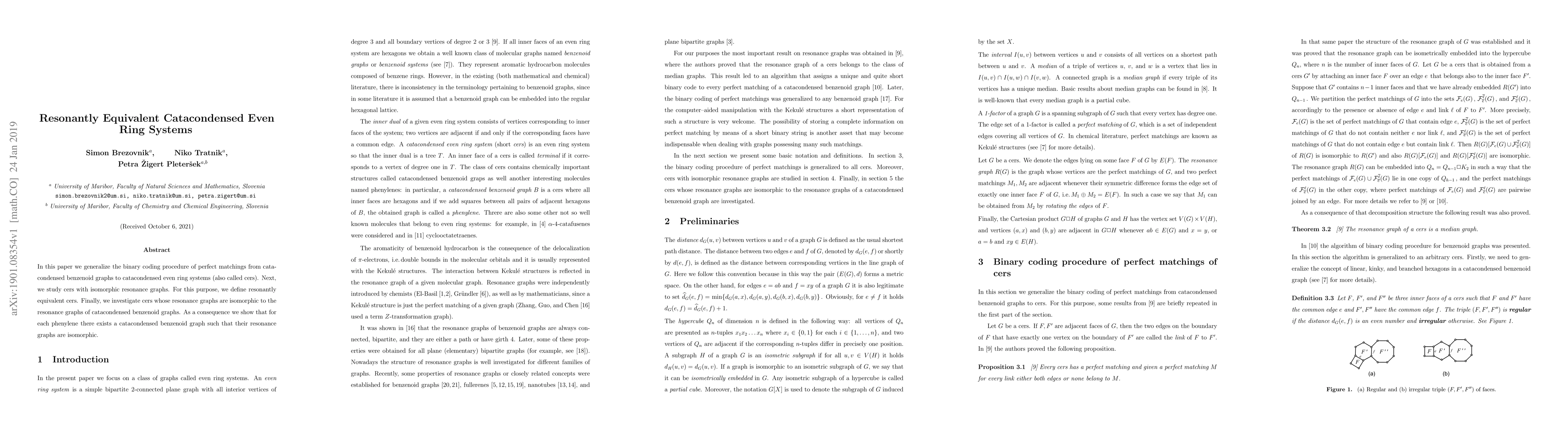 In this paper we generalize the binary coding procedure of perfect matchings from catacondensed benzenoid graphs to catacondensed even ring systems (also called cers). Next, we study cers with isomorphic resonance graphs. For this purpose, we define resonantly equivalent cers. Finally, we investigate cers whose resonance graphs are isomorphic to the resonance graphs of catacondensed benzenoid graphs. As a consequence we show that for each phenylene there exists a catacondensed benzenoid graph such that their resonance graphs are isomorphic.
