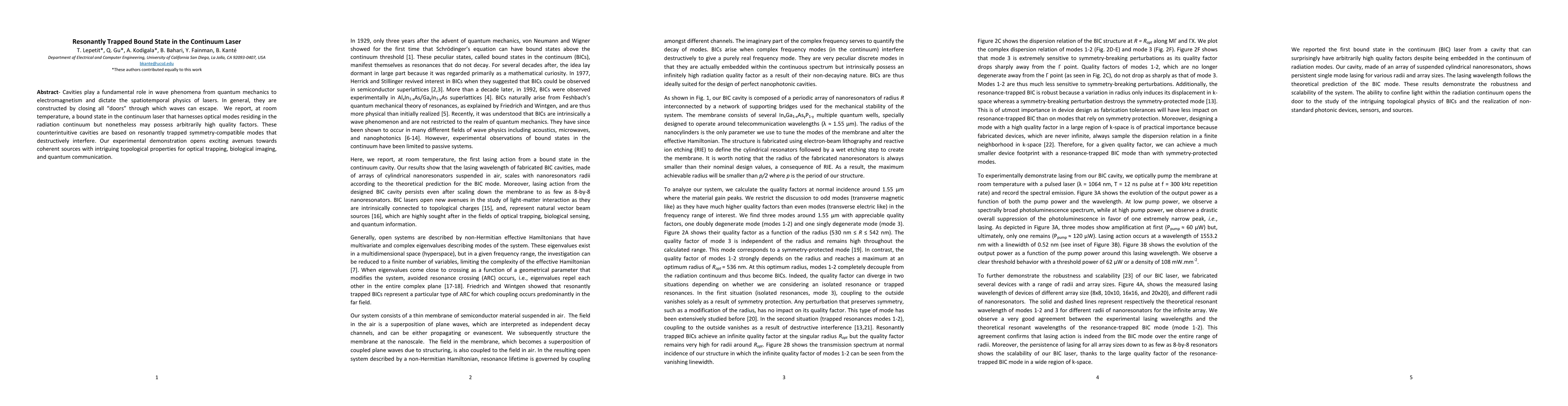 This paper reports the creation of a bound state in the continuum laser at room temperature, utilizing resonantly trapped symmetry-compatible modes that interfere destructively, achieving high quality factors despite being in the radiation continuum. This innovation offers potential applications in optical trapping, biological imaging, and quantum communication.