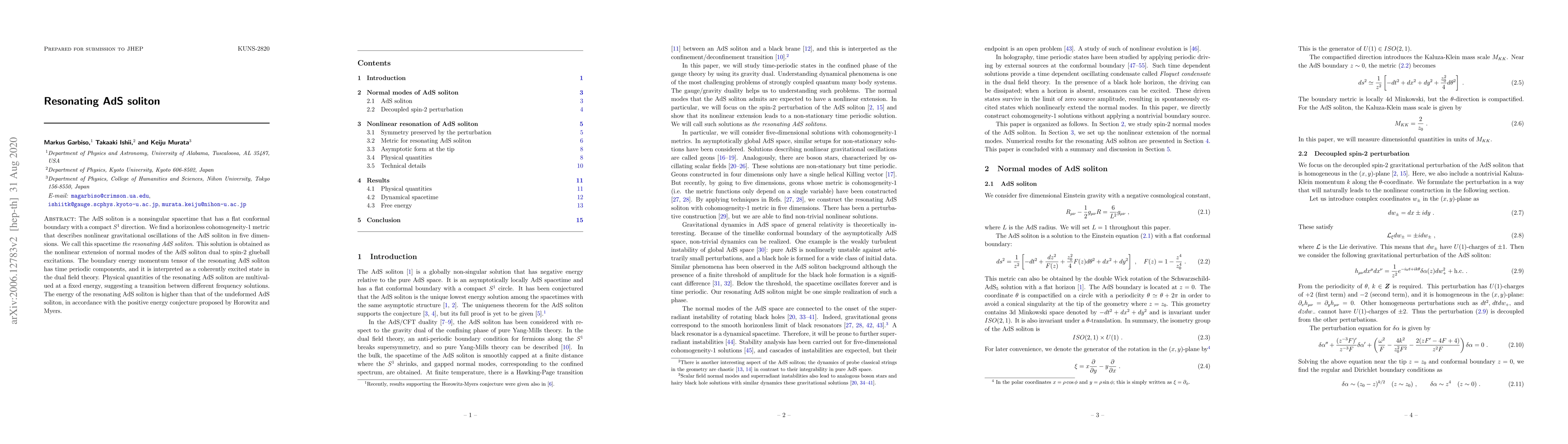 The paper presents a horizonless metric for a resonating AdS soliton in five dimensions, which describes nonlinear gravitational oscillations of the AdS soliton. This solution exhibits time-periodic components in its boundary energy momentum tensor, indicating a coherently excited state in the dual field theory.