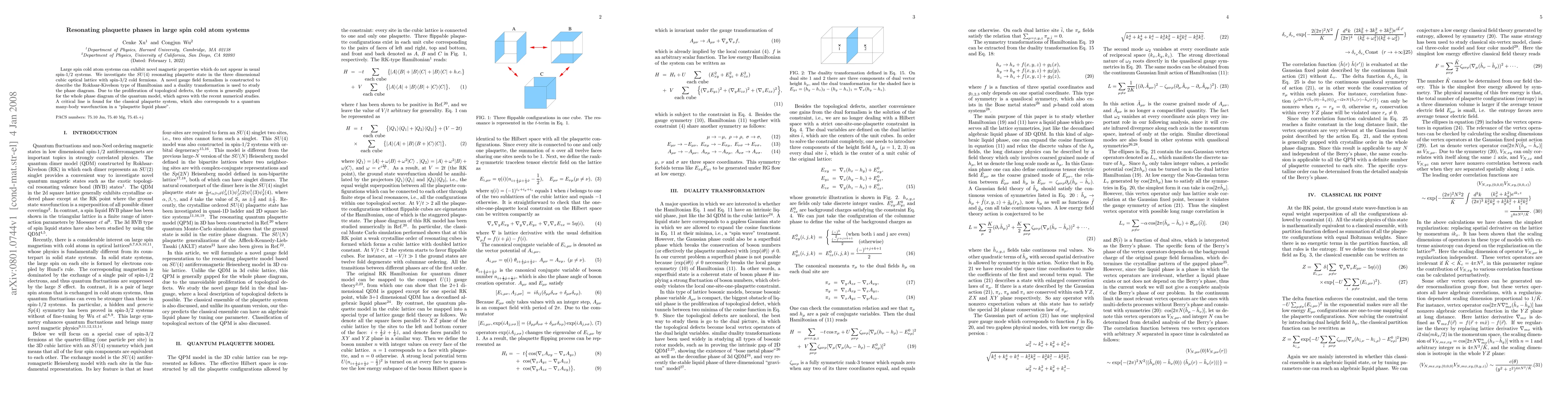Large spin cold atom systems can exhibit novel magnetic properties which do not appear in usual spin-1/2 systems. We investigate the SU(4) resonating plaquette state in the three dimensional cubic optical lattice with spin-3/2 cold fermions. A novel gauge field formalism is constructed to describe the Rokhsar-Kivelson type of Hamiltonian and a duality transformation is used to study the phase diagram. Due to the proliferation of topological defects, the system is generally gapped for the whole phase diagram of the quantum model, which agrees with the recent numerical studies. A critical line is found for the classical plaquette system, which also corresponds to a quantum many-body wavefunction in a "plaquette liquid phase".