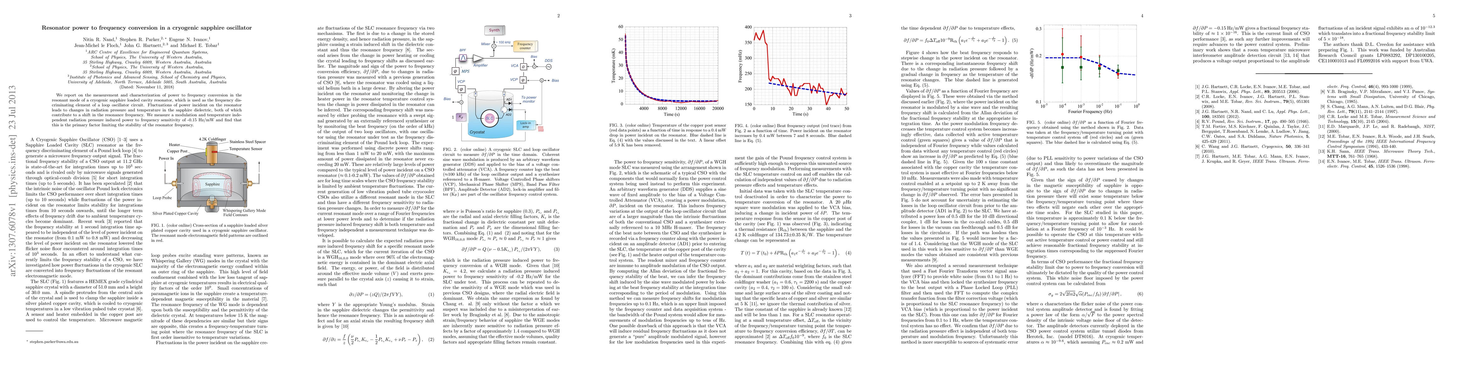 This study investigates power to frequency conversion in a cryogenic sapphire resonator, finding that fluctuations in incident power cause shifts in resonance frequency due to radiation pressure and temperature changes. The primary stability limitation is a modulation and temperature independent sensitivity of -0.15 Hz/mW.