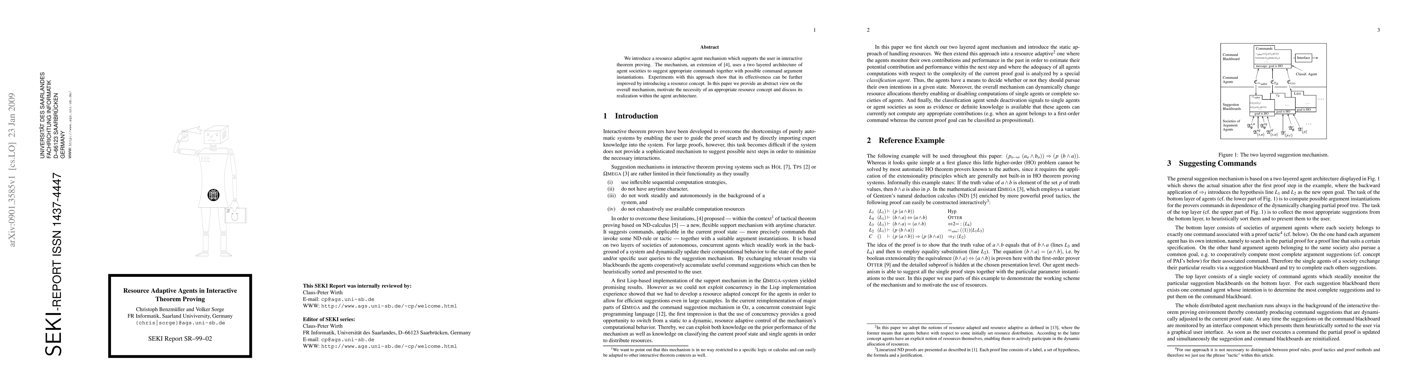 This paper presents a resource adaptive agent mechanism for interactive theorem proving, utilizing a two-layered architecture of agent societies to suggest commands and arguments. The study highlights the necessity of incorporating a resource concept to enhance the effectiveness of the mechanism.