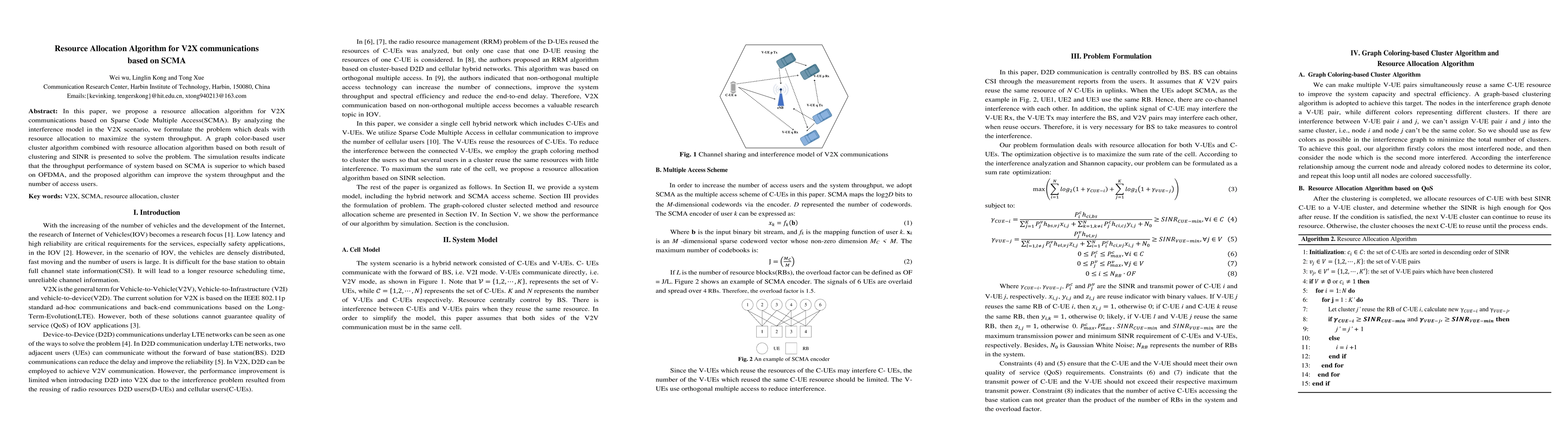 This paper proposes a resource allocation algorithm for V2X communications using SCMA to maximize system throughput, employing a graph color-based clustering method and SINR-based allocation. Simulation results show superior throughput performance compared to OFDMA and improved system capacity.