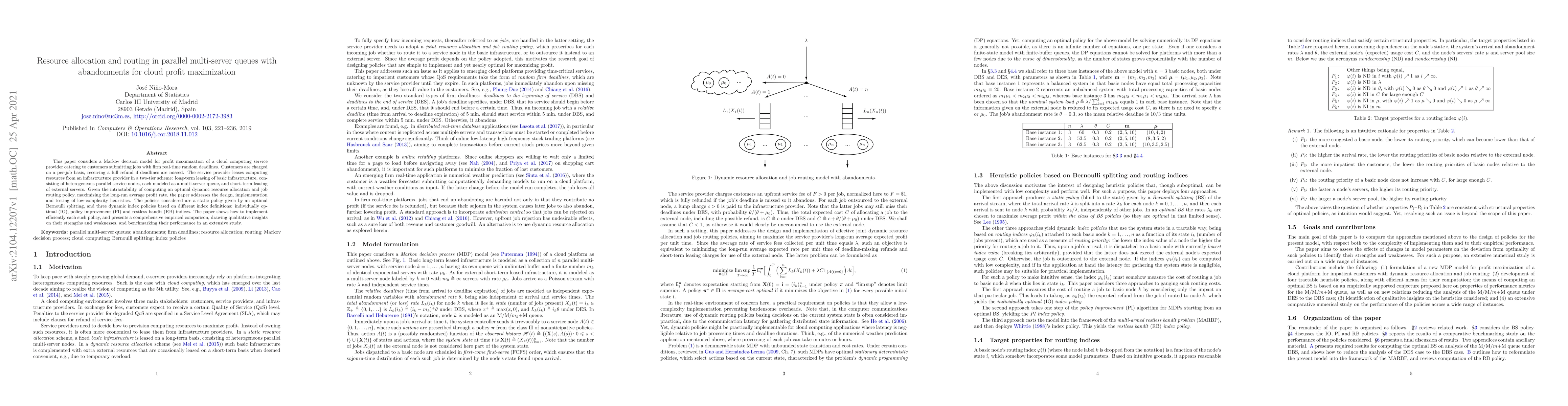 This paper develops heuristics for profit maximization in cloud computing services with abandonments, employing a Markov decision model to optimize resource allocation and job routing. It compares static and dynamic index policies, providing insights into their performance and practical implementation.