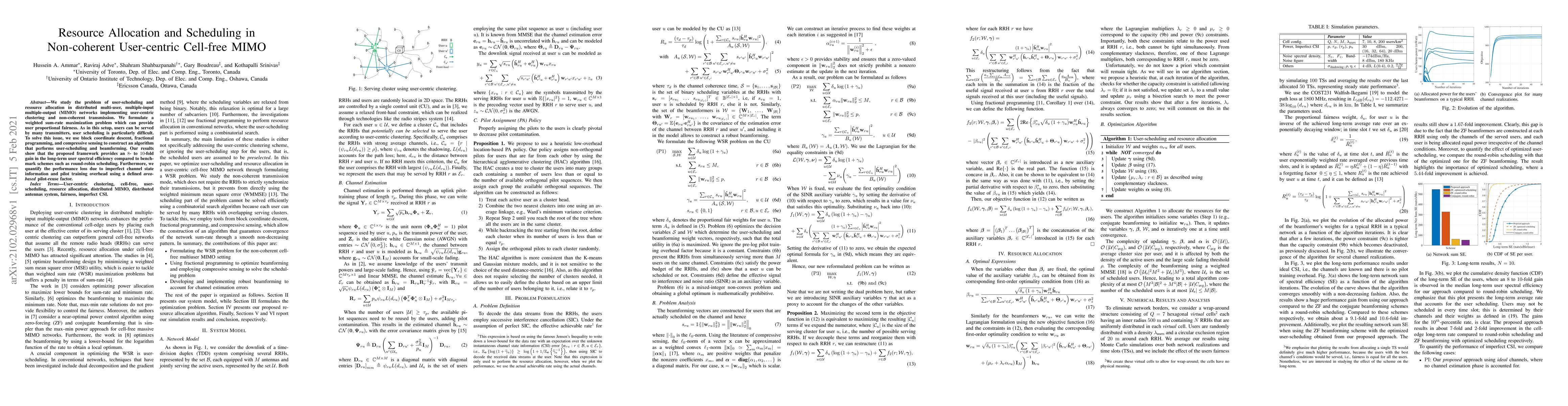 This paper proposes an algorithm for user scheduling and resource allocation in non-coherent, user-centric cell-free MIMO networks, employing block coordinate descent, fractional programming, and compressive sensing. The framework achieves an 8- to 10-fold improvement in long-term user spectral efficiency over benchmark methods, while also quantifying performance losses due to imperfect channel state information and pilot training overhead.