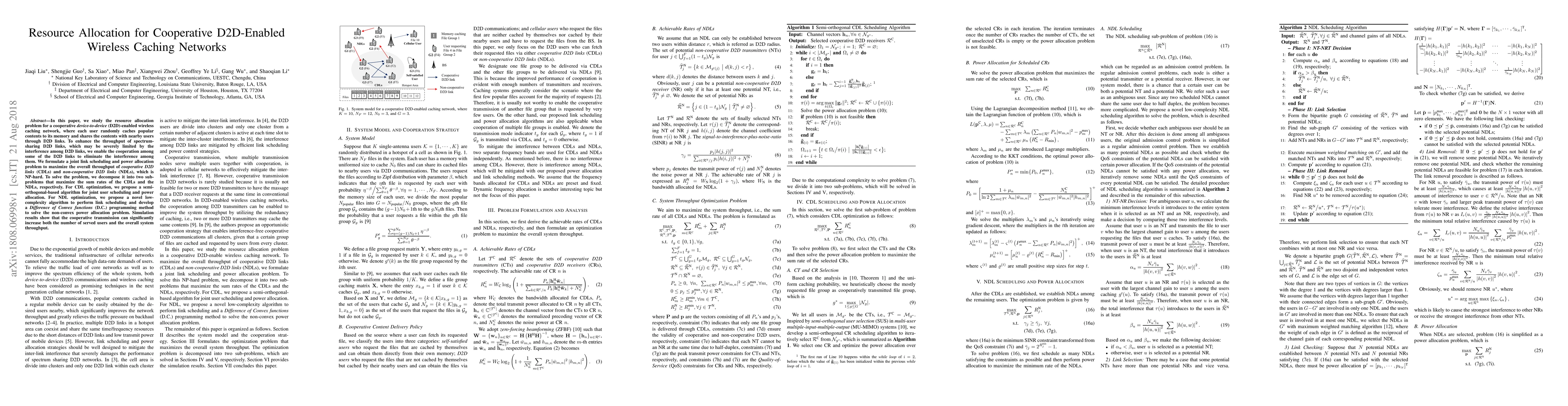 This paper explores resource allocation in cooperative D2D-enabled wireless caching networks, focusing on maximizing throughput through joint link scheduling and power allocation. It proposes algorithms for optimizing cooperative D2D links and non-cooperative D2D links, demonstrating significant improvements in system throughput via cooperative transmission.