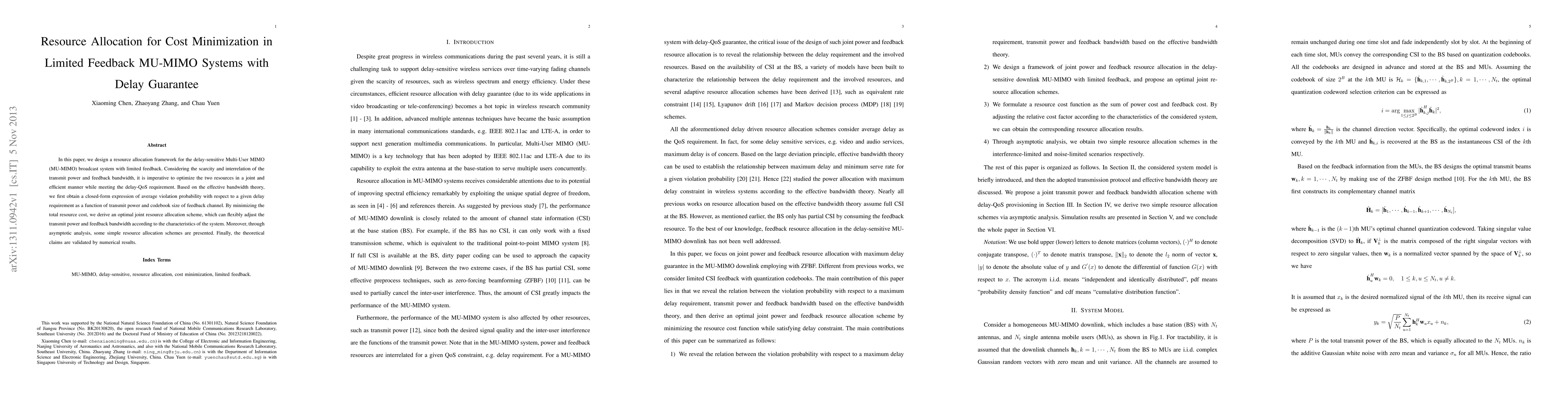 This paper proposes a resource allocation framework for delay-sensitive Multi-User MIMO systems with limited feedback, aiming to minimize costs while meeting delay requirements. It derives an optimal scheme based on effective bandwidth theory and validates the approach with numerical results.