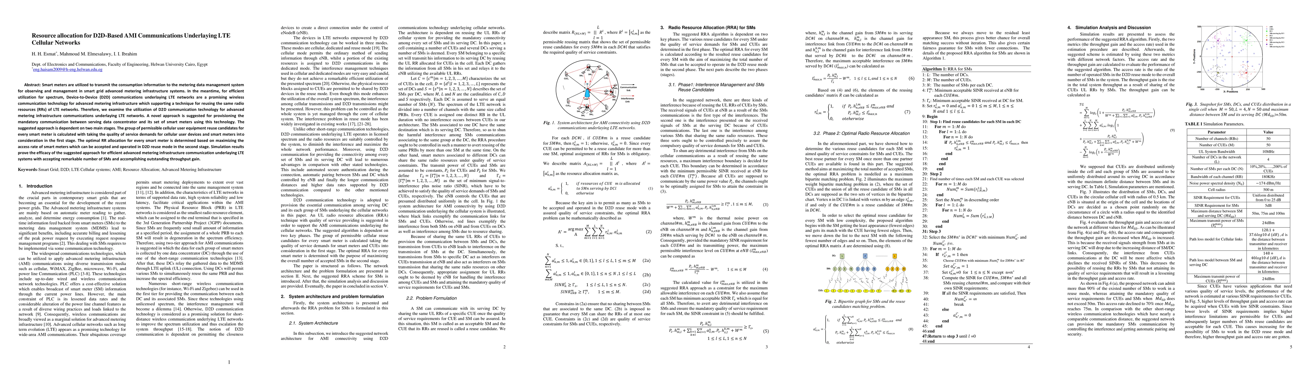 This paper proposes a novel resource allocation method for Device-to-Device (D2D) communications in advanced metering infrastructure (AMI) systems underlaying LTE networks. The approach optimizes radio resource allocation to maximize the number of smart meters that can operate in D2D mode, achieving significant throughput gains.