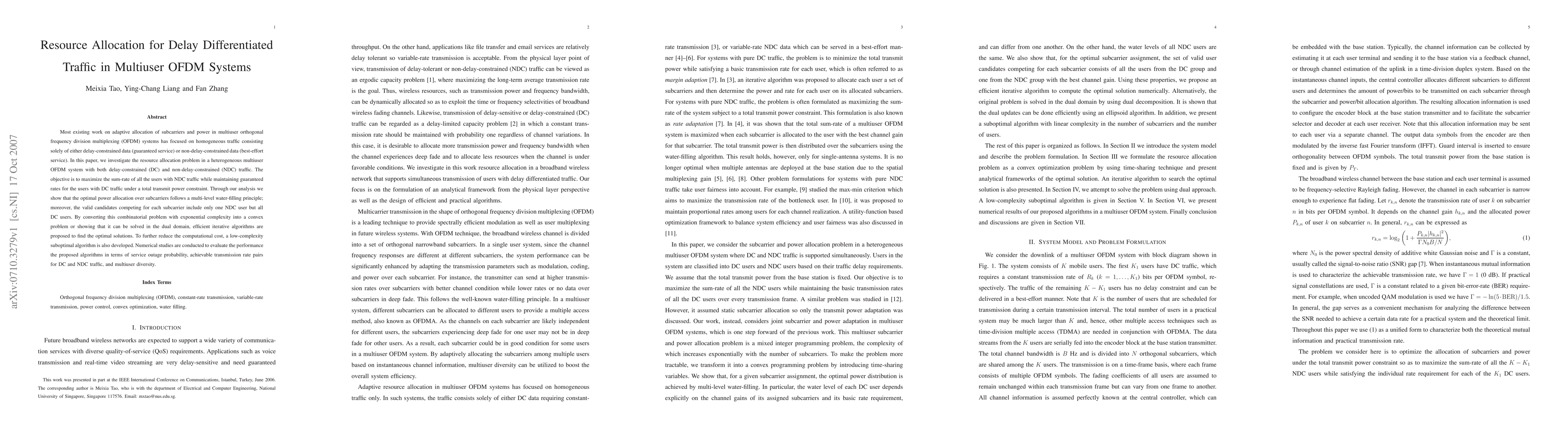 This paper proposes resource allocation strategies for multiuser OFDM systems handling both delay-constrained and non-delay-constrained traffic. The goal is to maximize the sum-rate for non-delay-constrained users while ensuring guaranteed rates for delay-constrained users, with efficient iterative algorithms developed to solve the problem.