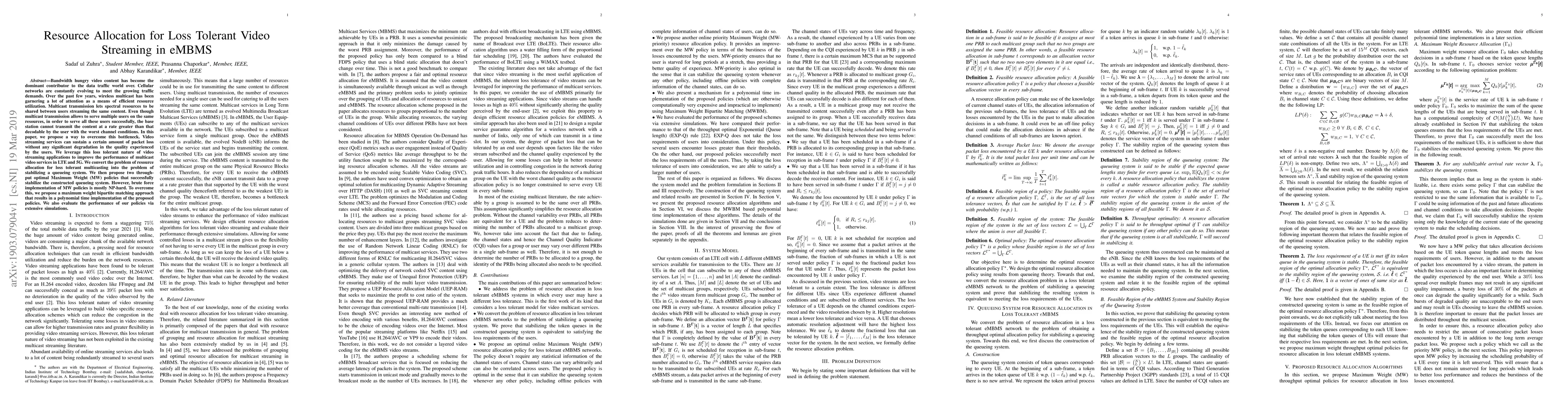 This paper proposes resource allocation strategies for efficient multicast video streaming in LTE and 5G networks, leveraging the loss tolerance of video content. It introduces two throughput optimal Maximum Weight policies to stabilize a queueing system, and uses a polynomial time maximum weight bipartite matching approach to implement these policies efficiently.