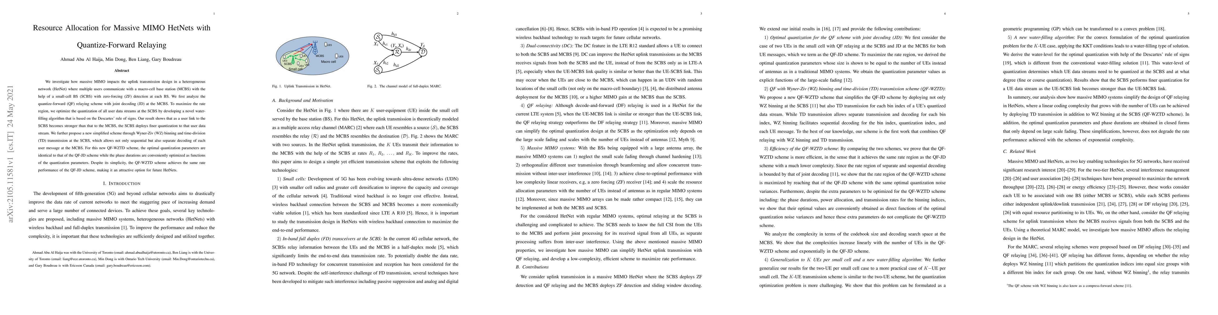 This paper explores resource allocation in massive MIMO heterogeneous networks (HetNets) using quantize-forward relaying. It develops a novel water-filling algorithm based on Descartes' rule for optimizing quantization at small-cell base stations (SCBS) to maximize the rate region, showing improved performance when user links to SCBS are stronger. A simplified QF-WZTD scheme is also proposed, achieving the same rate performance as the complex QF-JD scheme, offering a simpler yet effective solution for future HetNets.