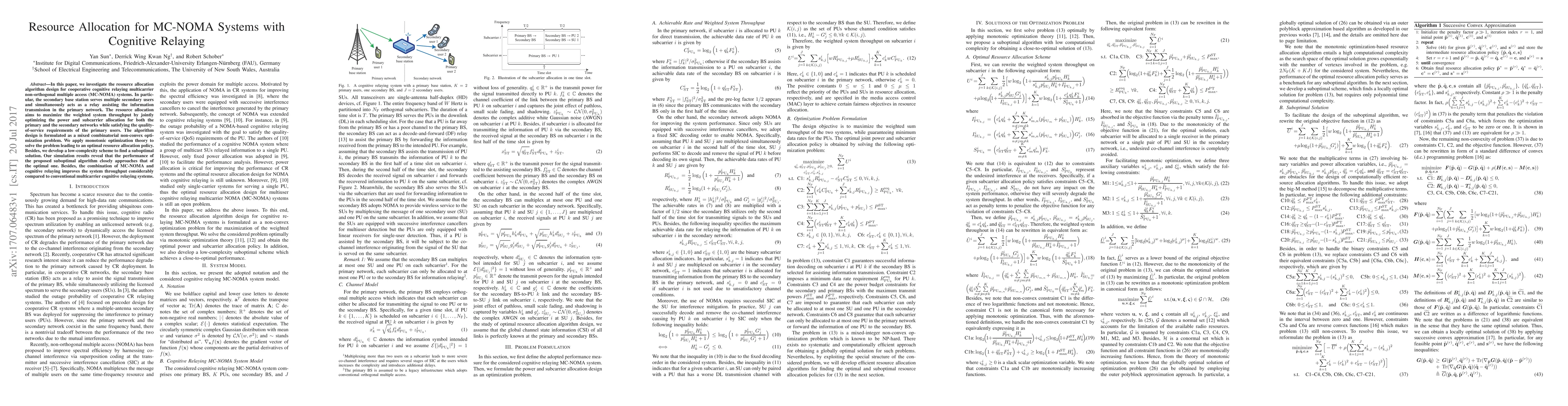 This paper designs resource allocation algorithms for cooperative cognitive relaying multicarrier non-orthogonal multiple access (MC-NOMA) systems, optimizing power and subcarrier allocation to maximize weighted system throughput while meeting primary users' quality-of-service requirements. The proposed optimal solution leverages monotonic optimization theory, and a low-complexity suboptimal algorithm is also developed, showing near-optimal performance.