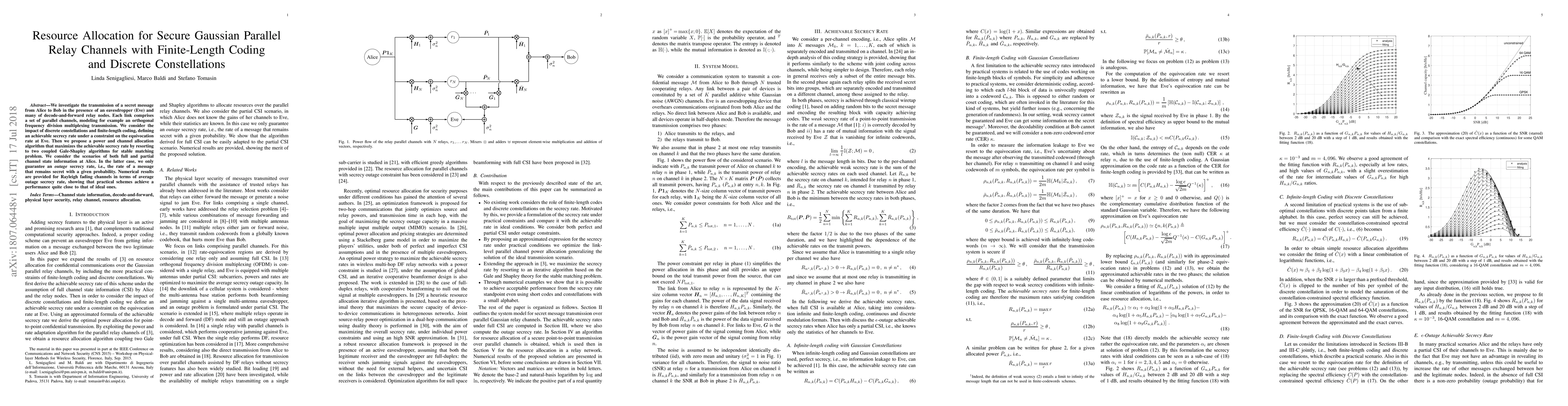 We investigate the transmission of a secret message from Alice to Bob in the presence of an eavesdropper (Eve) and many of decode-and-forward relay nodes. Each link comprises a set of parallel channels, modeling for example an orthogonal frequency division multiplexing transmission. We consider the impact of discrete constellations and finite-length coding, defining an achievable secrecy rate under a constraint on the equivocation rate at Eve. Then we propose a power and channel allocation algorithm that maximizes the achievable secrecy rate by resorting to two coupled Gale-Shapley algorithms for stable matching problem. We consider the scenarios of both full and partial channel state information at Alice. In the latter case, we only guarantee an outage secrecy rate, i.e., the rate of a message that remains secret with a given probability. Numerical results are provided for Rayleigh fading channels in terms of average outage secrecy rate, showing that practical schemes achieve a performance quite close to that of ideal ones.