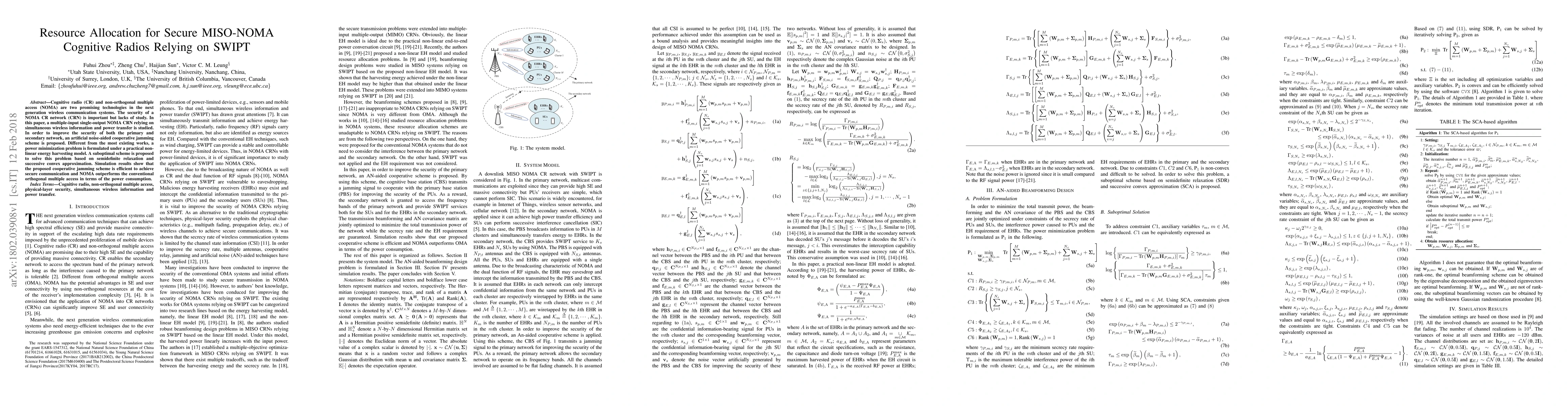 This paper investigates secure resource allocation for a multiple-input single-output NOMA cognitive radio network using SWIPT. An artificial noise-aided cooperative jamming scheme is proposed to enhance security, and a power minimization problem is solved using semidefinite relaxation and successive convex approximation. Simulation results demonstrate the efficiency of the scheme in achieving secure communication, with NOMA showing better power consumption compared to orthogonal multiple access.