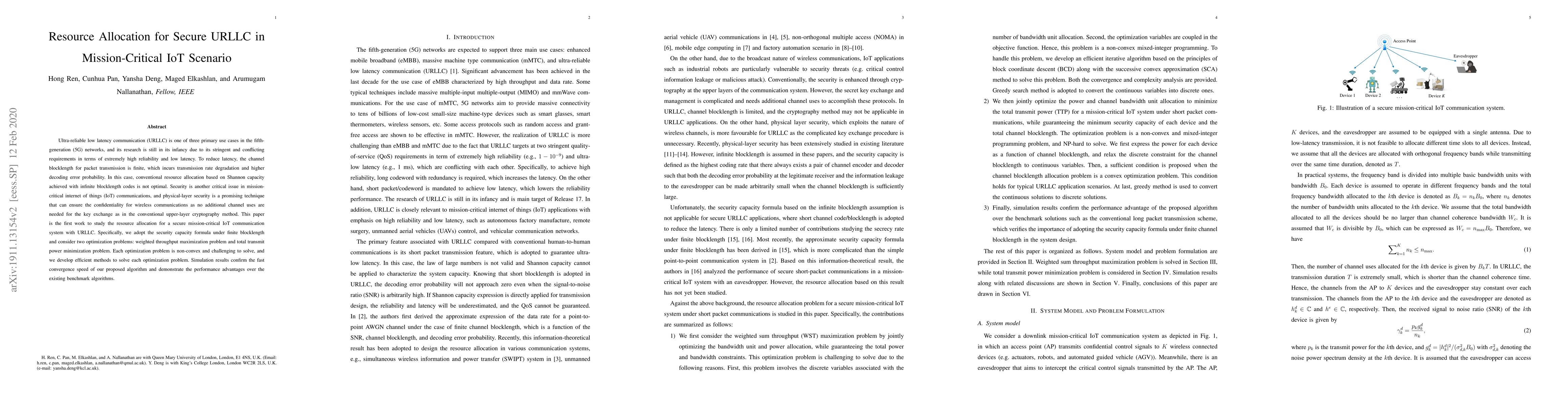 This paper investigates resource allocation strategies for secure ultra-reliable low latency communication (URLLC) in mission-critical IoT scenarios, addressing the challenges of finite channel blocklengths and physical-layer security. It proposes efficient algorithms for optimizing throughput and minimizing transmit power, demonstrating superior performance through simulations.