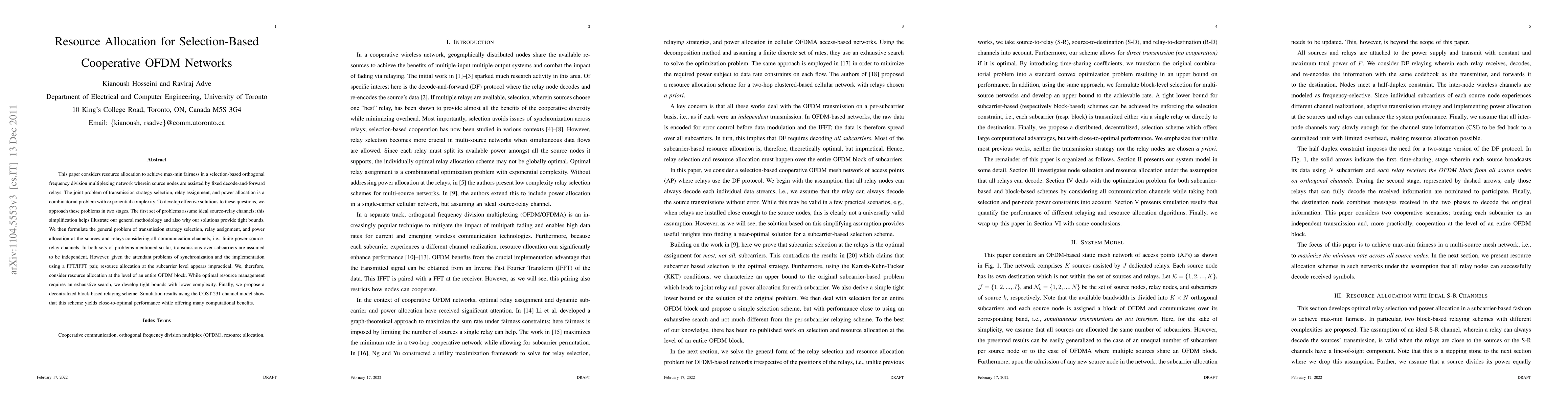 This paper develops resource allocation strategies for selection-based cooperative OFDM networks to achieve max-min fairness, proposing a two-stage approach with simplified ideal channels followed by a general model considering all communication channels. It introduces a decentralized block-based relaying scheme that offers near-optimal performance with reduced computational complexity.