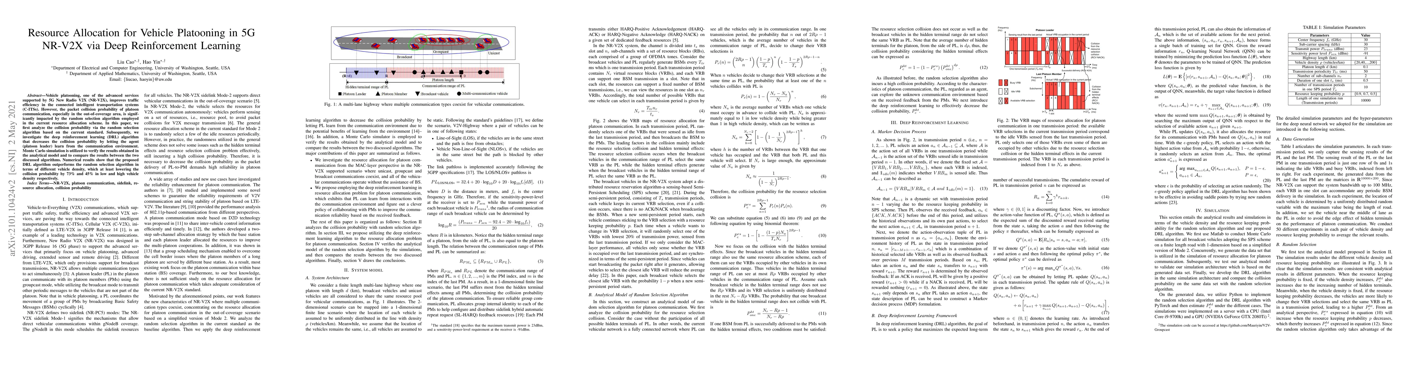This paper proposes a deep reinforcement learning (DRL) algorithm for resource allocation in vehicle platooning over 5G NR-V2X to improve packet delivery ratio and reduce collision probability. The DRL algorithm outperforms the current random selection method, significantly lowering collision probability by 73% and 45% in low and high vehicle density scenarios respectively, as verified by Monte Carlo simulations.