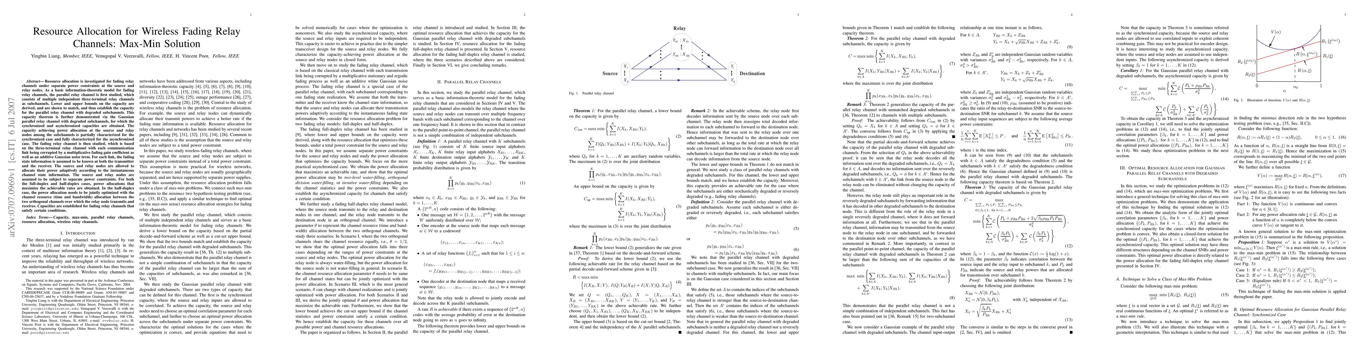 This paper investigates resource allocation strategies for wireless fading relay channels, deriving capacity bounds and achieving capacities for both parallel and fading relay channels. It focuses on max-min solutions for maximizing achievable rates in both full-duplex and half-duplex scenarios.