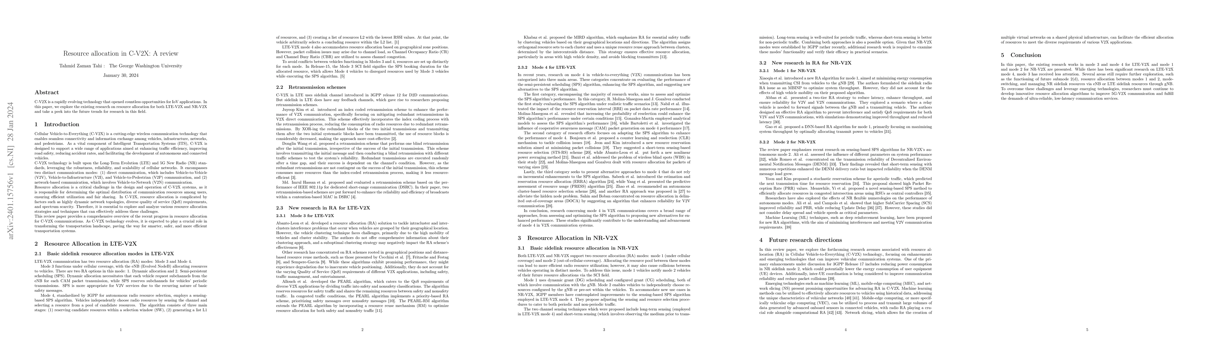 This review paper examines the challenges and strategies in resource allocation for Cellular Vehicle-to-Everything (C-V2X) communications, focusing on optimizing the distribution of communication resources to enhance traffic efficiency, safety, and the development of autonomous vehicles amidst dynamic network conditions and diverse QoS requirements.