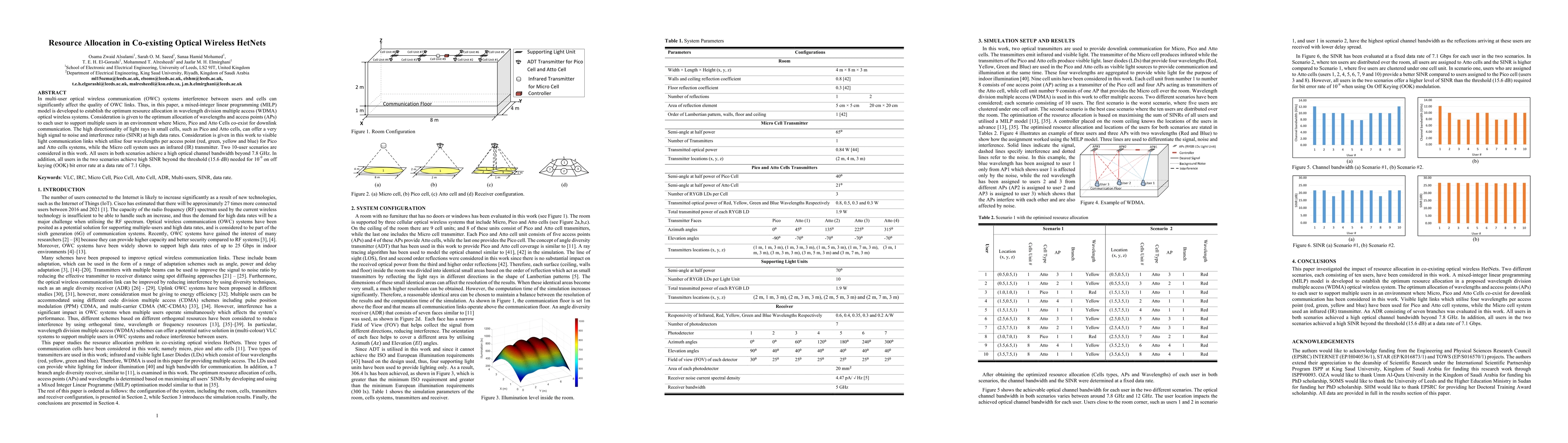 This paper develops a mixed-integer linear programming model for optimal resource allocation in multi-user optical wireless communication systems, focusing on wavelength and access point allocation in co-existing Micro, Pico, and Atto Cells. It achieves high data rates and signal-to-noise ratios using visible light communication with four wavelengths per access point for Pico and Atto Cells, and infrared for Micro Cells.