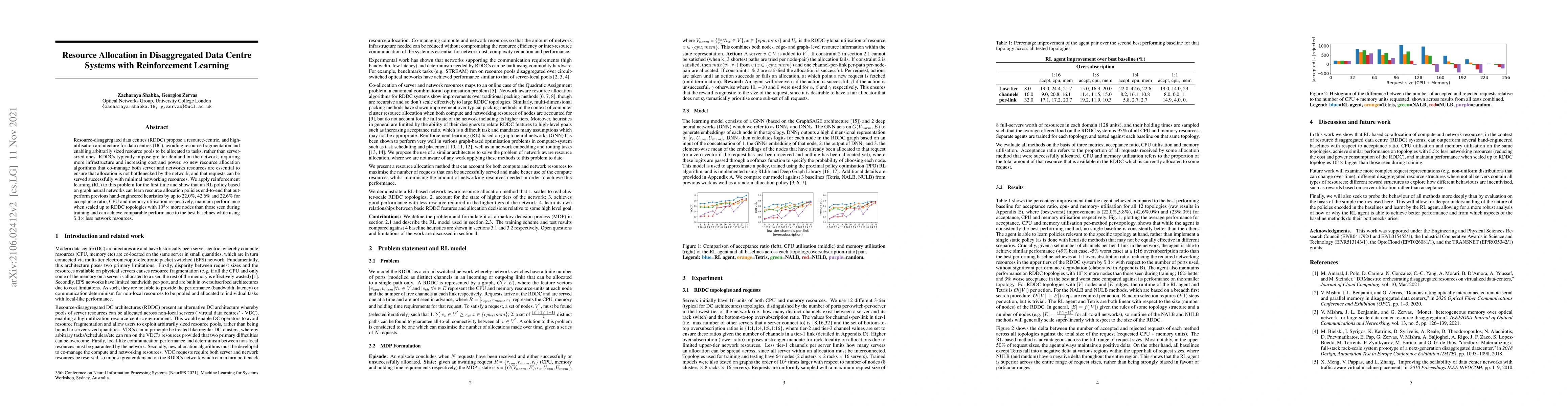 This paper explores reinforcement learning for resource allocation in resource-disaggregated data centres, demonstrating that a graph neural network-based RL policy can outperform traditional heuristics by up to 22.6% in various metrics while using significantly less network resources. The RL approach scales effectively to larger topologies.